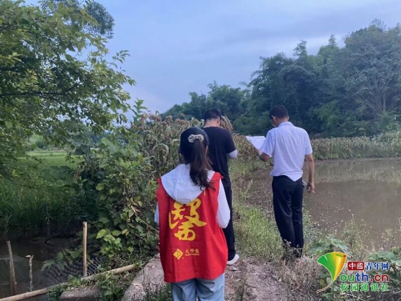 图为团队成员随政府工作人员一起调查鸭池村种植情况。中国青年网通讯员 邓婷媛 摄
