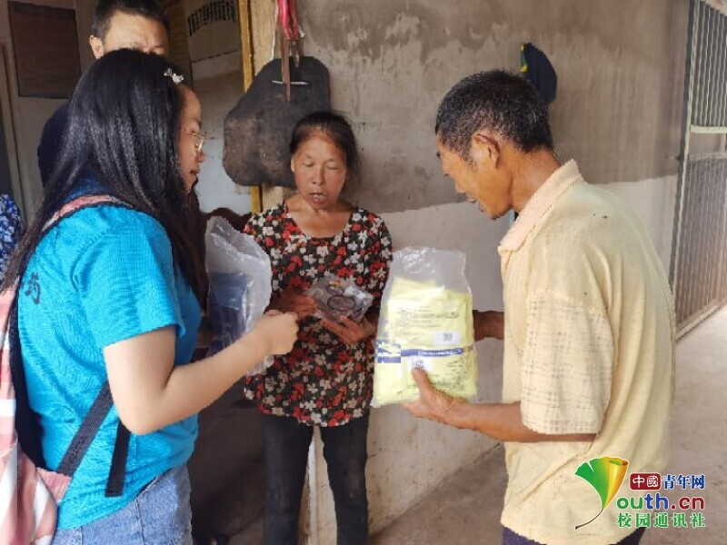 图为团队成员在分发兽药。中国青年网通讯员 涂如诗 摄