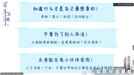 李丹钦、徐金晶和盛雯在第二场分享会上对学习方法和职业规划等方面进行了交流分享。首先李丹钦谈及在国外学习交流的一些经历,并向同学们推荐了实用的思维导图软件,以便同学们更好的学习和梳理知识。李丹钦在分享会中说到:“希望同学们少一些迷茫,多一些去尝试的勇敢,保持自己最初的热情。”