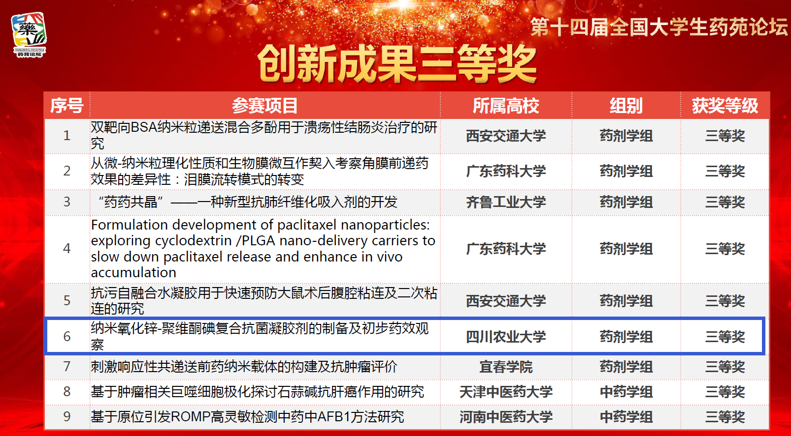 3月17日至3月18日,由全国药学类院校大学生专业技术与实验技能竞赛组委会主办,河北医科大学承办的“第十四届全国大学生药苑论坛”顺利落幕。bat365官网学子获得大赛创新成果三等奖(仅54项),本校是唯一以农业高校参赛并获奖的学校。自bat365官网参赛以来,已连续3次获奖,累计获得二等奖1个,三等奖2个。