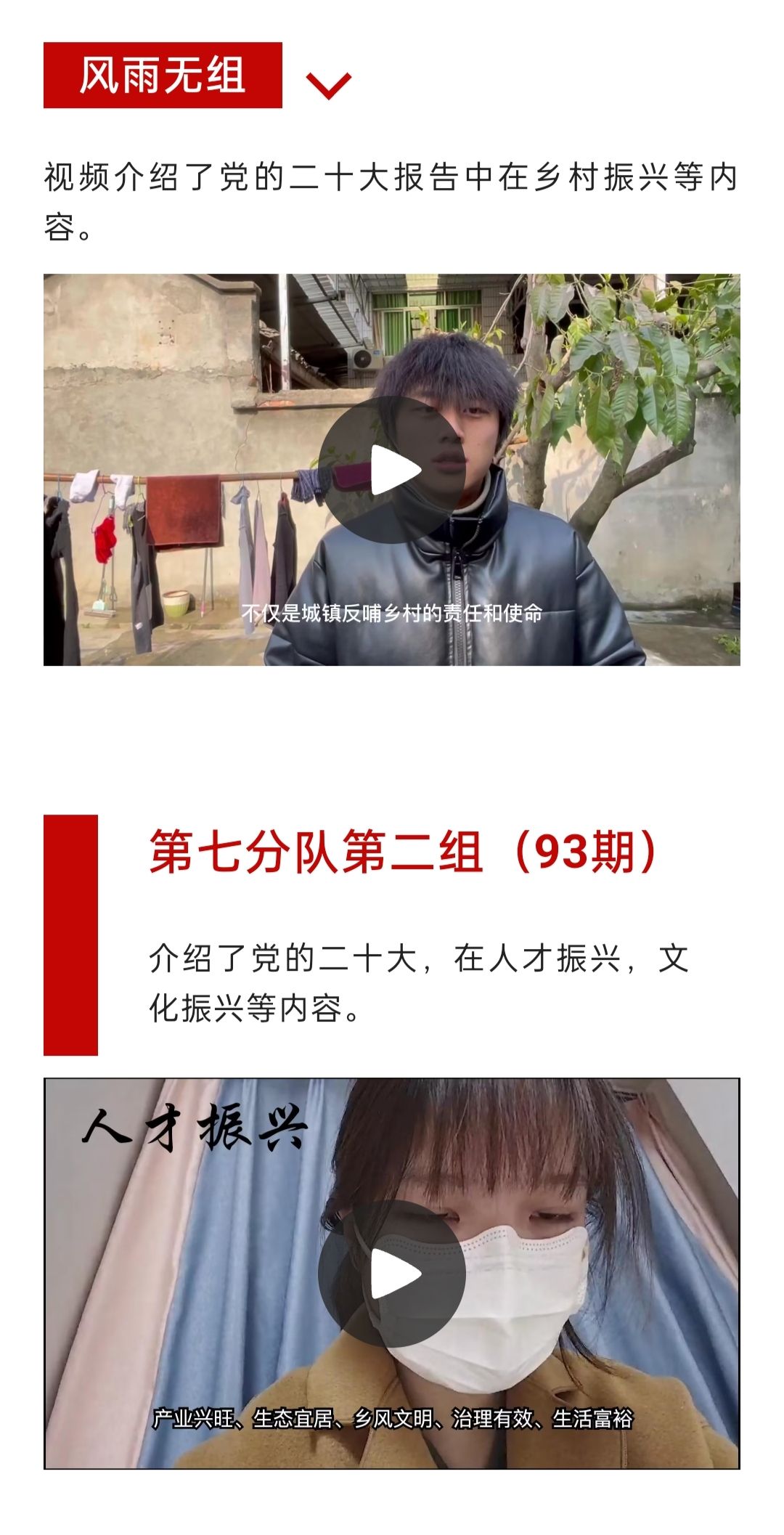 支部成员们自由组队并进行视频拍摄,于1月10日至1月24日进行投稿。本次活动共收集党支部作品8份,入党积极分子作品39份。随后由评委老师对收集到的作品进行打分,并取平均分最高的前八份作品进入网络评比。最终,经评委打分环节所得的平均分×0.7+网络评比环节得分×0.3选出了前三名,他们分别为第七分队第一小队(93期)、风雨无组和第一分队青年先锋F6队。