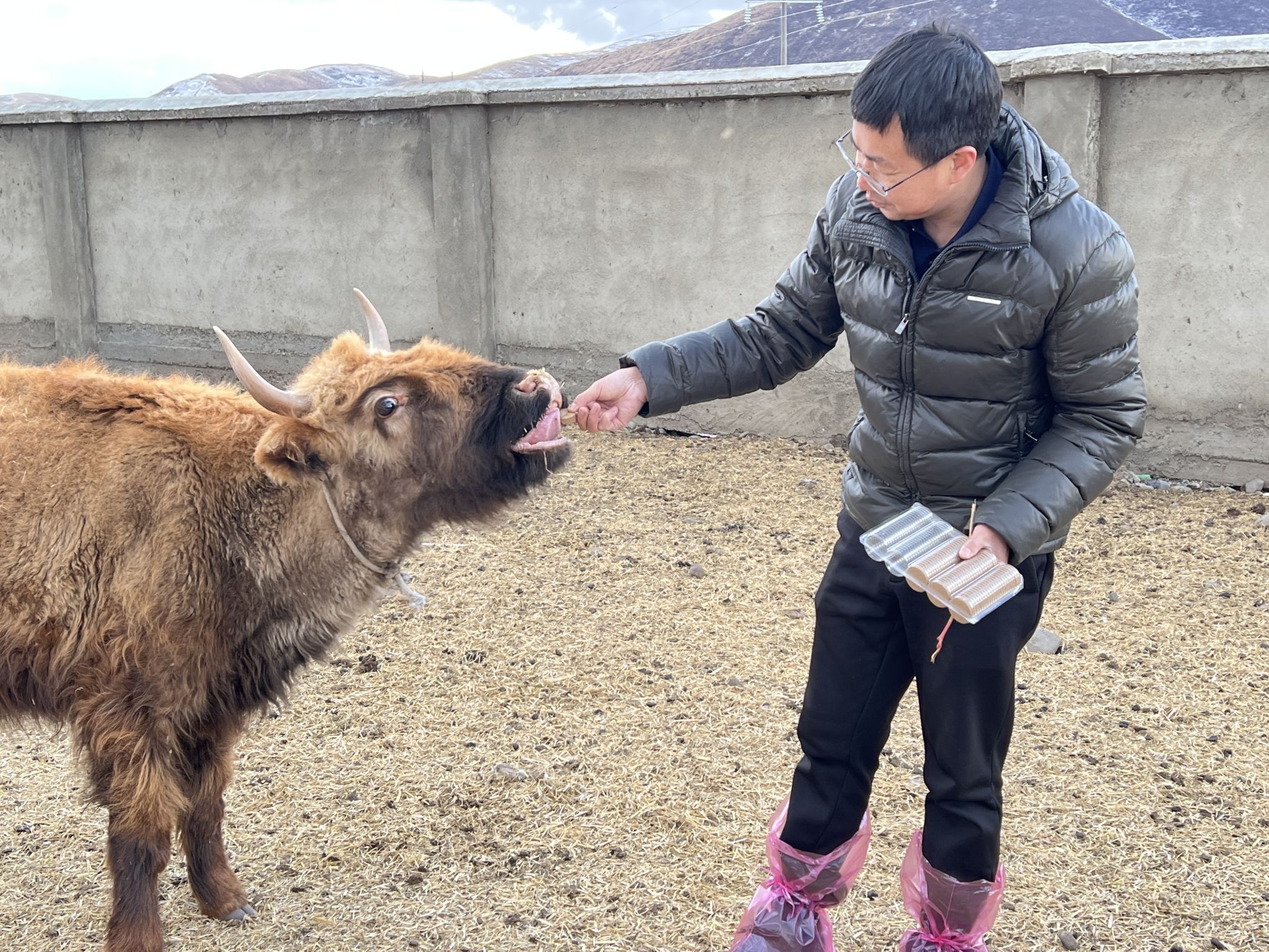 此外,专家团队还向各牧场赠送了养殖技术资料,并针对养殖过程中易出现应激、消化不良等疾病,给犊牛试喂了新研发的“抗应激、促消化”的肉牛牦牛专用压缩饼干,部分牦牛表现出特喜欢,跟着讨要饼干。