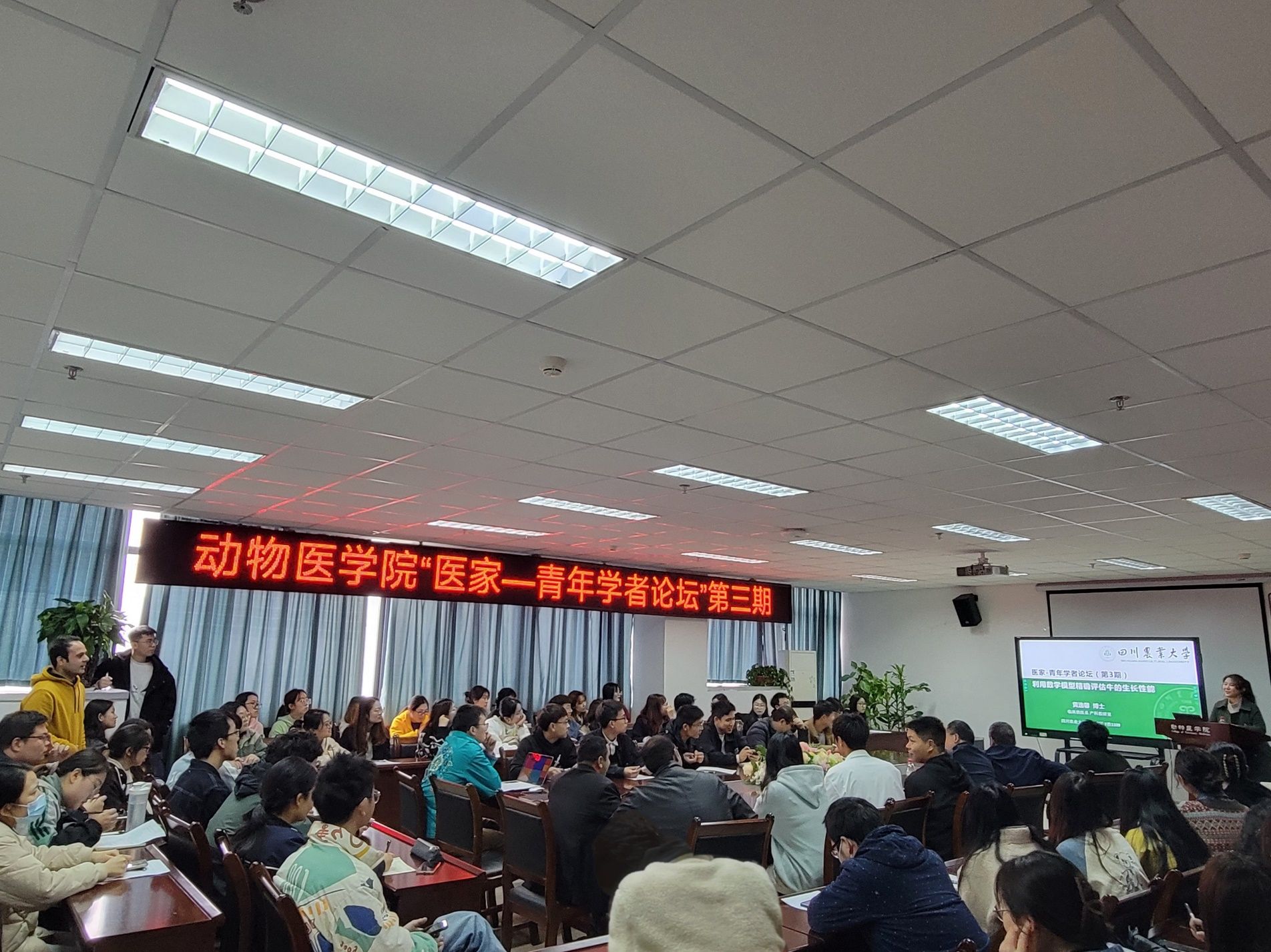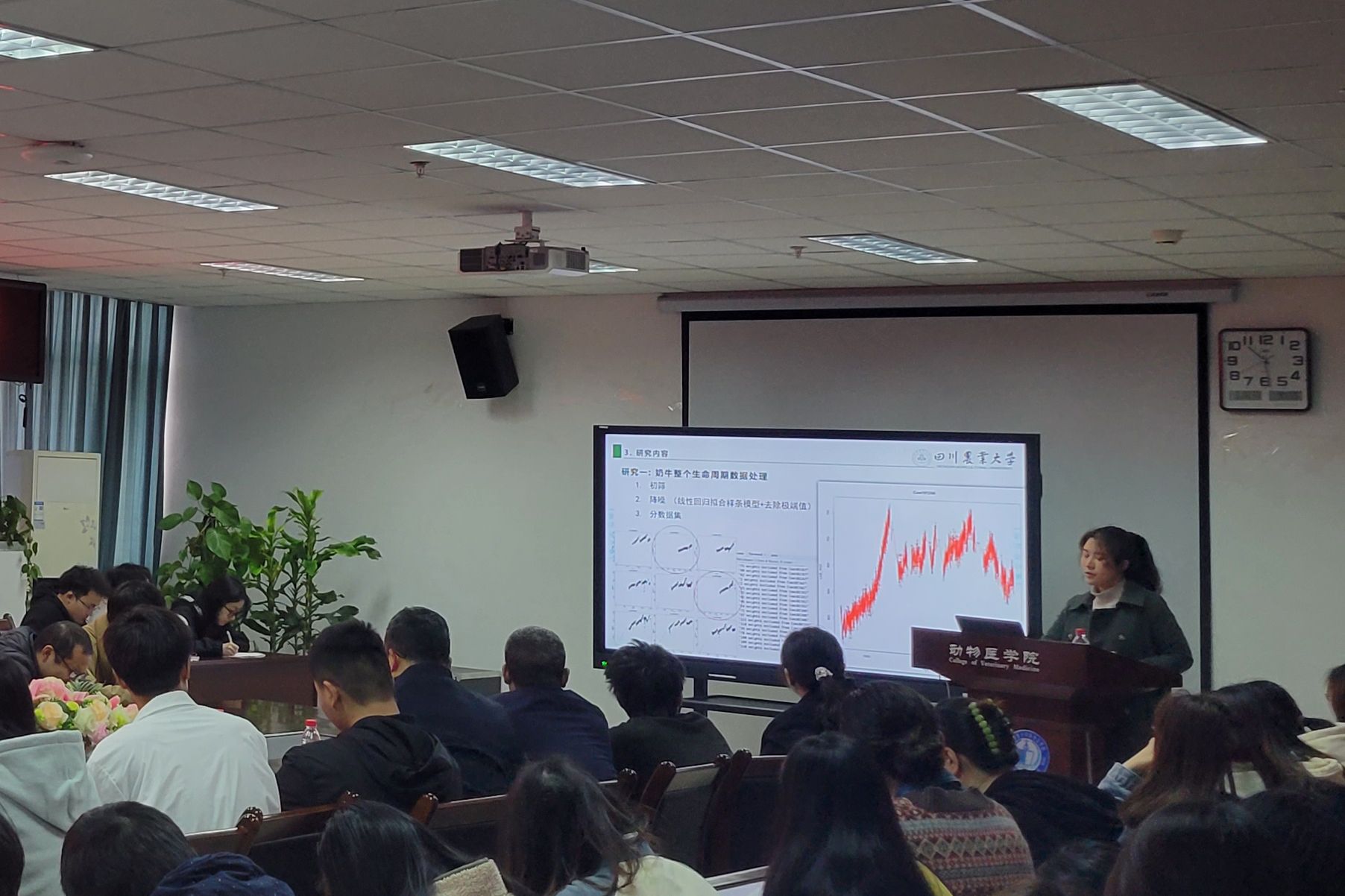 黄逸馨博士首先提出,生物统计学不仅在科学研究中占有关键地位,在临床兽医学领域中也能发挥重要作用。接下来,她介绍了大数据的处理与分析方法以及牛不同生长阶段的最佳模型,并分享了最适非线性模型能提高对牛早期生长性能评估的精确度与统计功效的最新研究成果。最后,她介绍了国外关于精准畜牧的研究热点和未来研究方向。报告现场座无虚席,在场师生都对此次报告产生了浓厚的兴趣,并对感兴趣的问题进行了交流与探讨,现场氛围非常热烈。