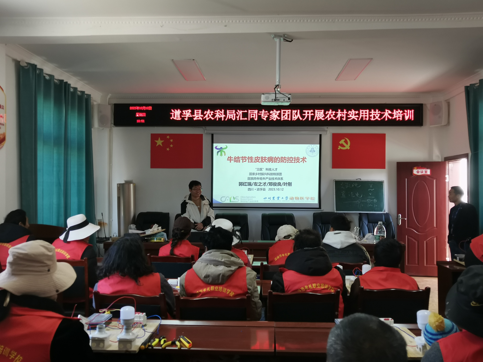 在道孚县麻孜乡菜子坡村和道孚县龙灯乡,郭红瑞对40余名基层农机人员及种养殖户以及种养殖户进行了牦牛养殖及疾病防控技术的专题培训。郭红瑞讲解了牦牛疾病的防控要领,重点强调日常管理和疫苗防控的重要性。针对近年牛结节性皮肤病危害严重,详细讲解了该病的流行情况、诊断与防控技术,以及疑似病例的处置方案、预防措施等,同时教授了与牛结节性皮肤相似的如牛乳头状瘤、皮肤真菌感染、牛皮蝇蛆病等的鉴别诊断与防治技术。