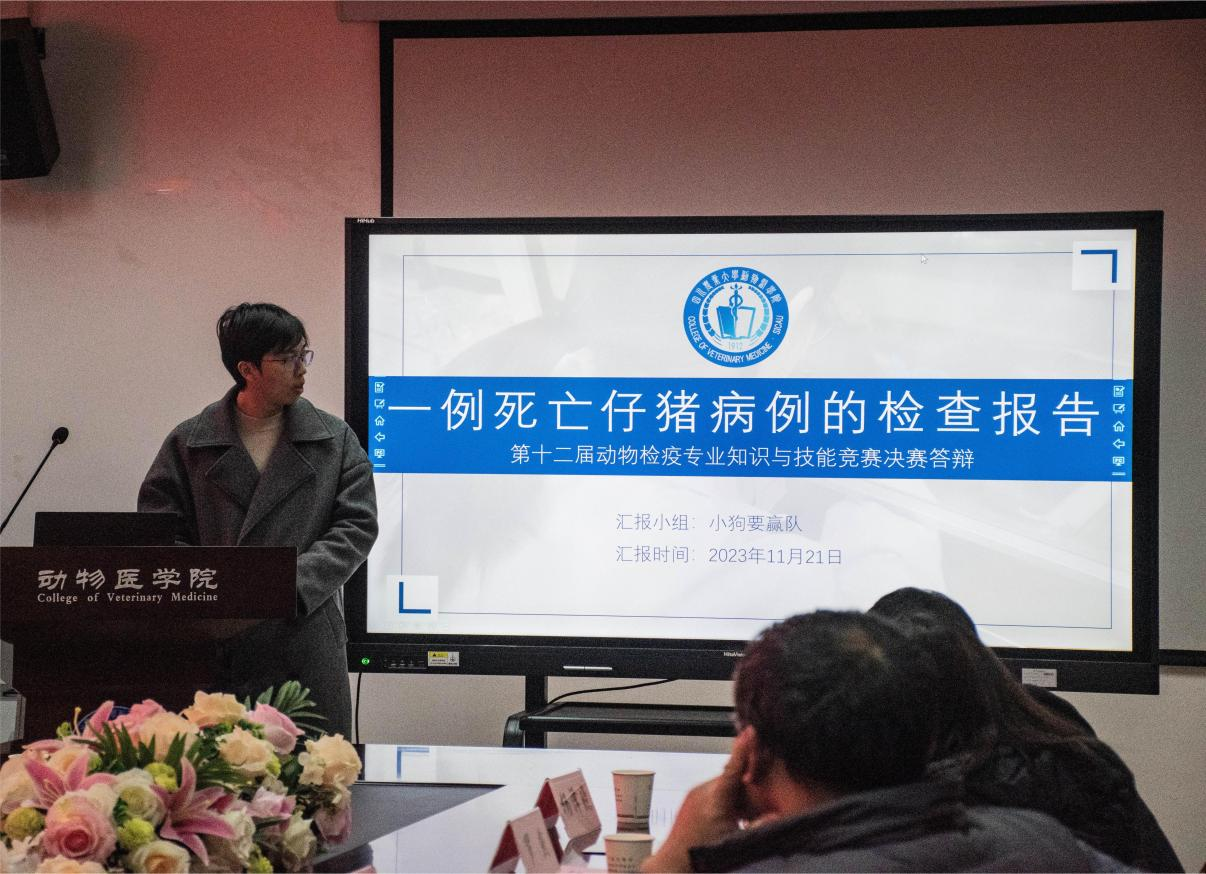 在现场答辩环节中,各队伍代表按抽签顺序依次答辩,紧紧围绕病猪解剖情况、实验室检测、结果分析、相应疾病预防治疗方法等方面进行汇报。汇报人从容自信,条理清晰地展示团队的成果。“该猪疑似混合感染了副猪嗜血杆菌、猪肺炎支原体、圆环病毒,因患呼吸道疾病综合征(PRDC)而死亡”,“选取适合当地PRRSV和HPS流行株血清型的疫苗”等结论和预防措施受到了评委的赞赏。知识竞答环节中,选手们认真分析,积极探讨得出结论,观众们在台下也认真学习,表现出极大的学习热情。