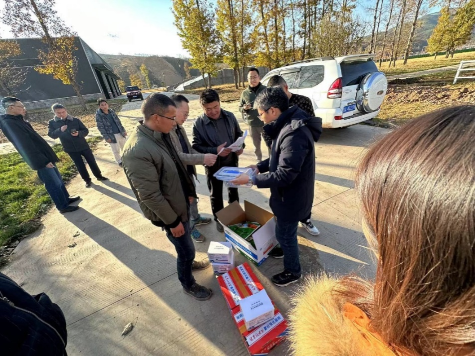专家组在给肉牛养殖户赠送药品并指导临床应用