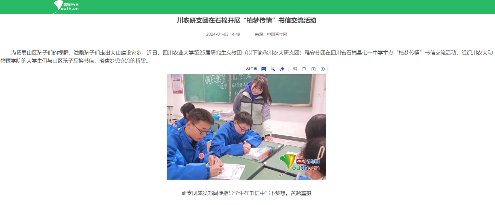 (中国青年网报道链接:https://xibu.youth.cn/gzdt/gddt/202401/t20240103_15002025.htm,学校新闻报道链接:https://news.sicau.edu.cn/info/1133/75049.htm)