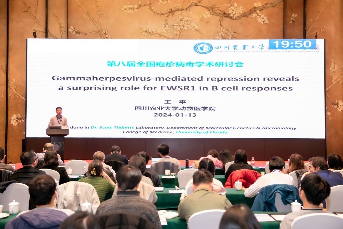 bat365官方网站青年教师王一平博士受邀参会,并以《Gammaherpesvirus-mediated repression reveals a surprising role for EWSR1 in B cell responses》(γ疱疹病毒介导的抑制揭示EWSR1在B细胞反应中具有重要作用)为题作大会报告。报告中,王一平博士分享了他在动物疱疹病毒感染与免疫研究领域取得的科研成果。