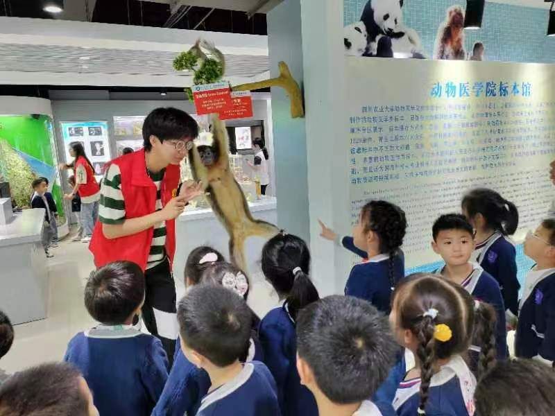 在bat365官方网站标本馆内,孩子们的目光紧紧跟随着讲解员唐睿、李琴、王贝爻的指引,他们的小手不时举起,争先恐后地提出自己的好奇问题。“这个金丝猴标本是怎么制作的呢?”一个小女孩指着一只栩栩如生的川金丝猴标本问道。而旁边的小男孩则对一只美丽的孔雀标本充满好奇:“为什么孔雀的羽毛会有这么多颜色呢?”讲解员们耐心地一一作答,不仅介绍了标本馆的历史和科研成果,还用孩子们能够理解的语言,讲述了动物的习性和生存环境,让孩子们对生命的多样性和自然界的奥秘有了更深刻的认识。