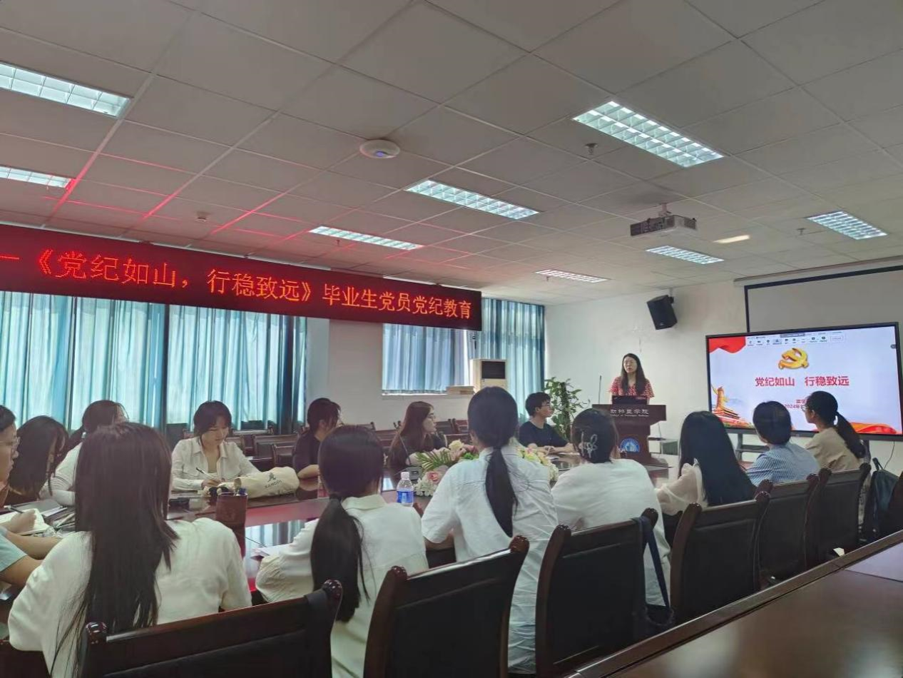 5月24日,bat365官方网站在7教1109会议室通过线上、线下相结合的方式,为全体毕业生党员带来了一场主题为“党纪如山,行稳致远”的辅导员公开党课。旨在深化毕业生党员对党纪的认识,加强党性教育,激励党员在新时代中发挥先锋模范作用。党课由学院党委办公室副主任、团委副书记苗宇主讲。