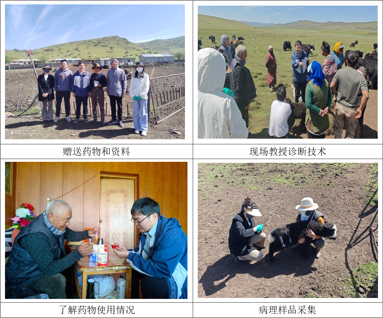 为了进一步了解当地牦牛养殖中存在的实际问题,5月24日上午,郭红瑞副教授一行还前往了红原县邛溪镇玛萨村,对当地反映的犊牛腹泻情况进行了现场诊断。在详细了解发病情况和用药情况后,专家团队为养殖户制定了治疗方案和预防措施,并赠送了相关的驱虫和抗腹泻药物。此外,团队还采集了20余份腹泻犊牛的肛门试子,以期找出导致当地犊牛腹泻的主要病因,为未来的牦牛疾病综合防治提供科学依据。
