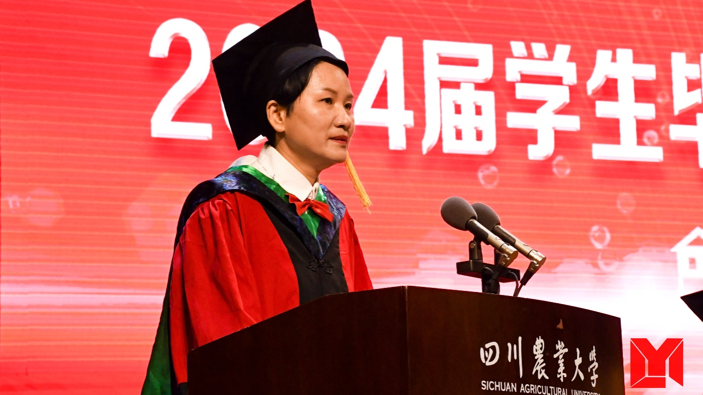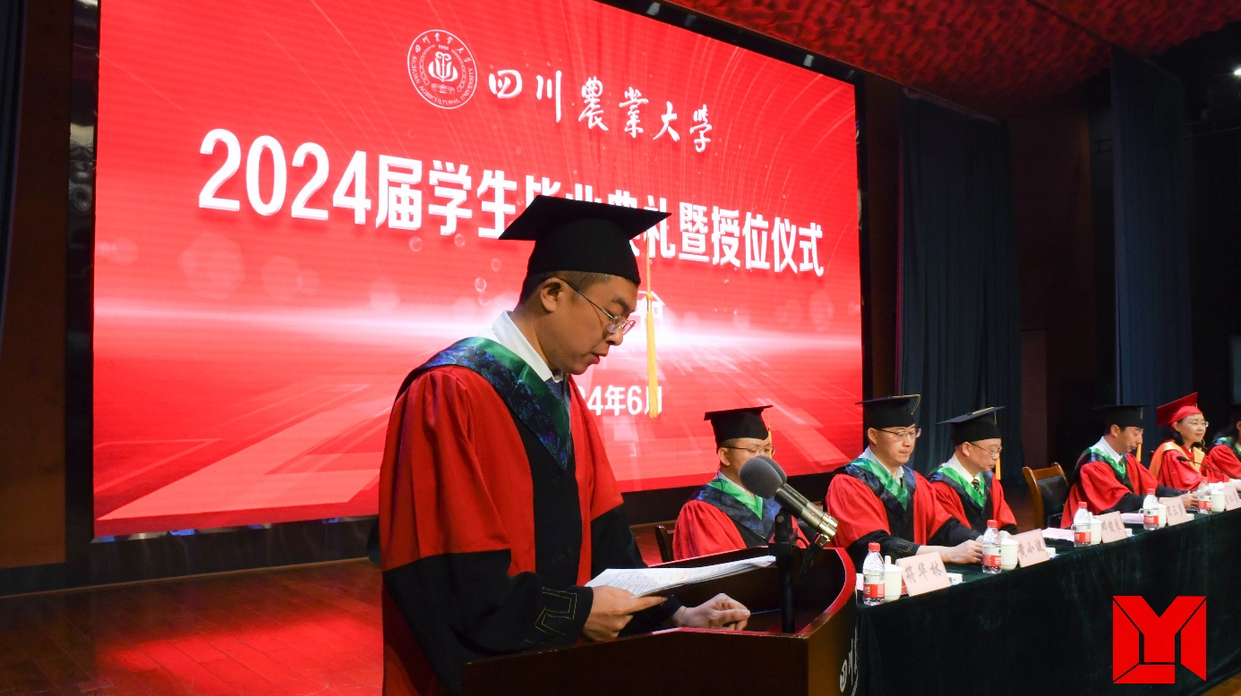 典礼开始,陈舜院长分别从校友、导师、院长三个角度为毕业生同学们送上了热辣滚烫的期许、殷殷叮嘱和深深祝福。希望同学们求学终身、慎思明辨;学有所用,学有有为;传递美好,创造价值、实现自我,成为人类和社会的有用之才。期盼同学们志存高远、无所畏惧,勇攀高峰、以梦为马,不负韶华,成为bat365官方网站的骄傲。祝福同学们在新的人生阶段,顺利变道,快速入轨,高速前行。带着川农人团结、拼搏、求实、创新、敬业的本色,奋笔书写自己人生新篇章,拥有张驰自如,惬意人生。