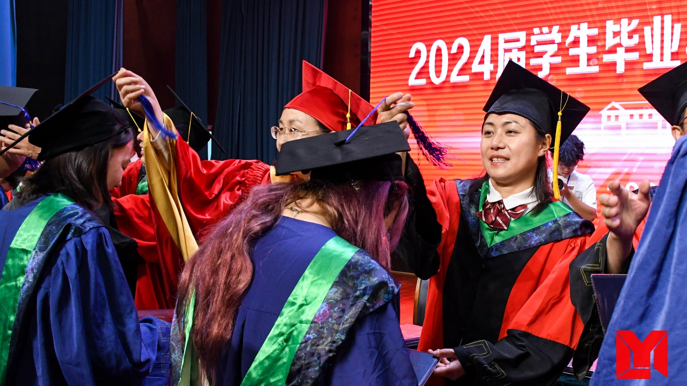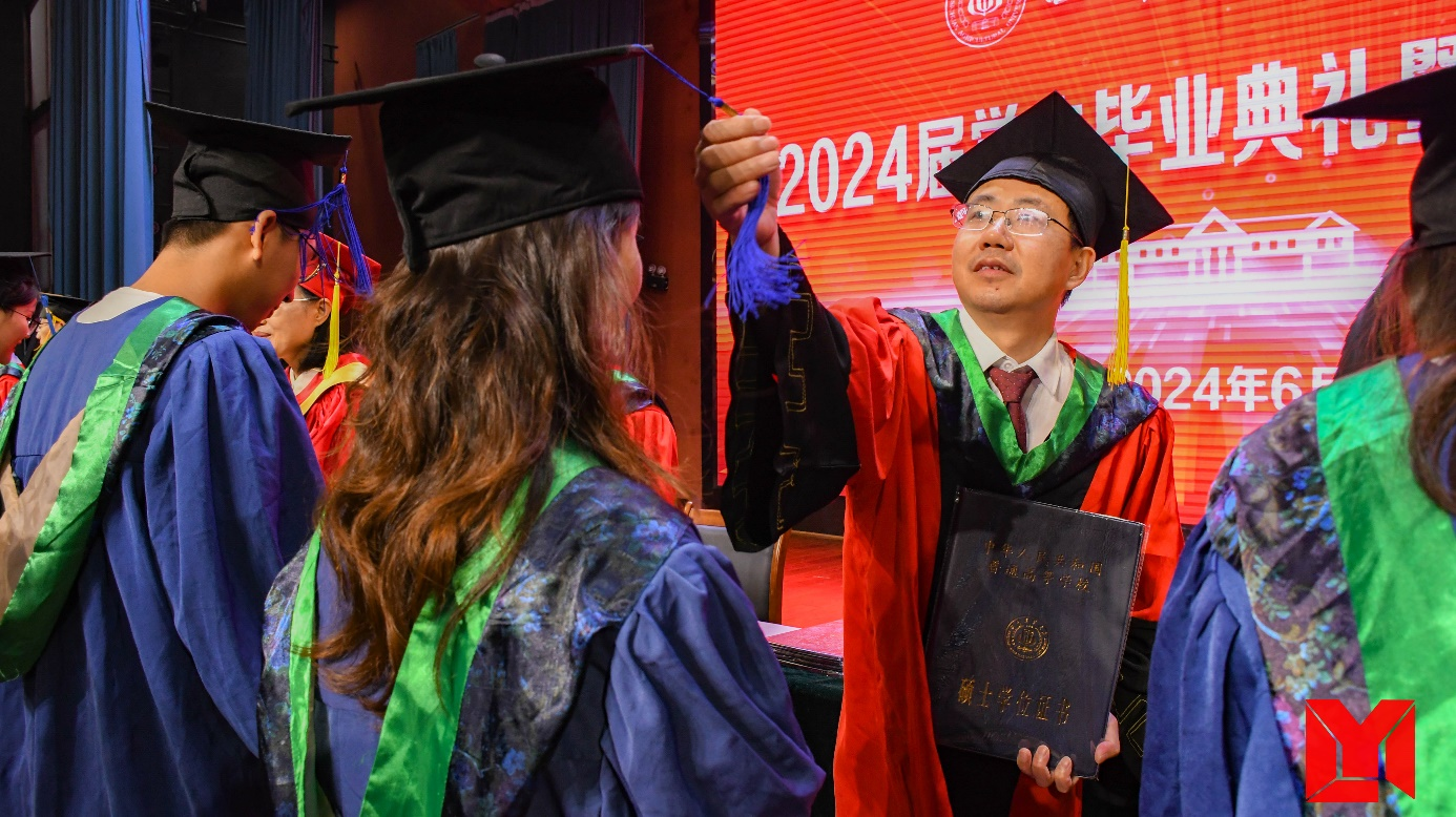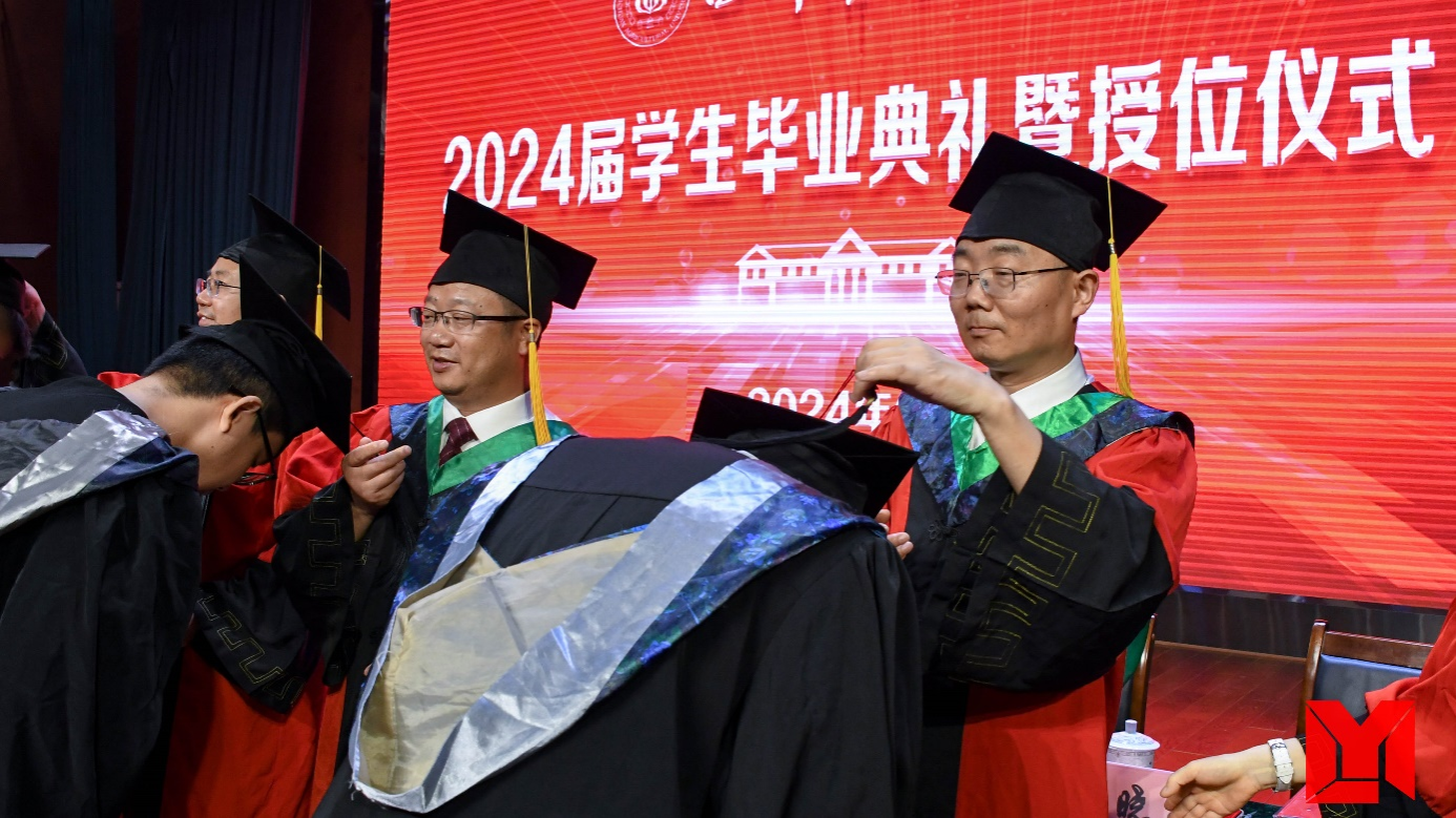 发言环节结束后,现场工作人员宣读了2024届研究生、本科生授位学生名单,由主席台就座领导为毕业生们拨穗授位。在热烈的掌声中,毕业生们分组上台接受授位,领导们为每一位毕业生拨穗、授予学位证书。最终,在欢快热烈的《歌唱祖国》歌声中本次典礼画上了圆满的句号。