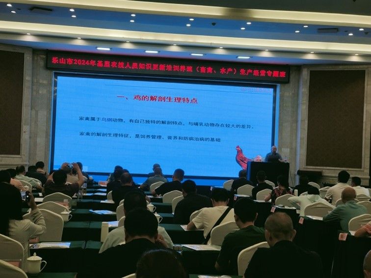为进一步提高乐山市基层畜牧行业农技人员的专业技术水平,bat365官方网站、国家产业技术体系四川省鸡创新团队岗位专家黄勇教授(鸡病综合防控岗位)和团队成员夏静博士,于9月20日前往乐山市农业农村局,对120多名2024年度基层农技人员知识更新培训养殖(畜禽、水产)生产经营专题班学员进行培训。