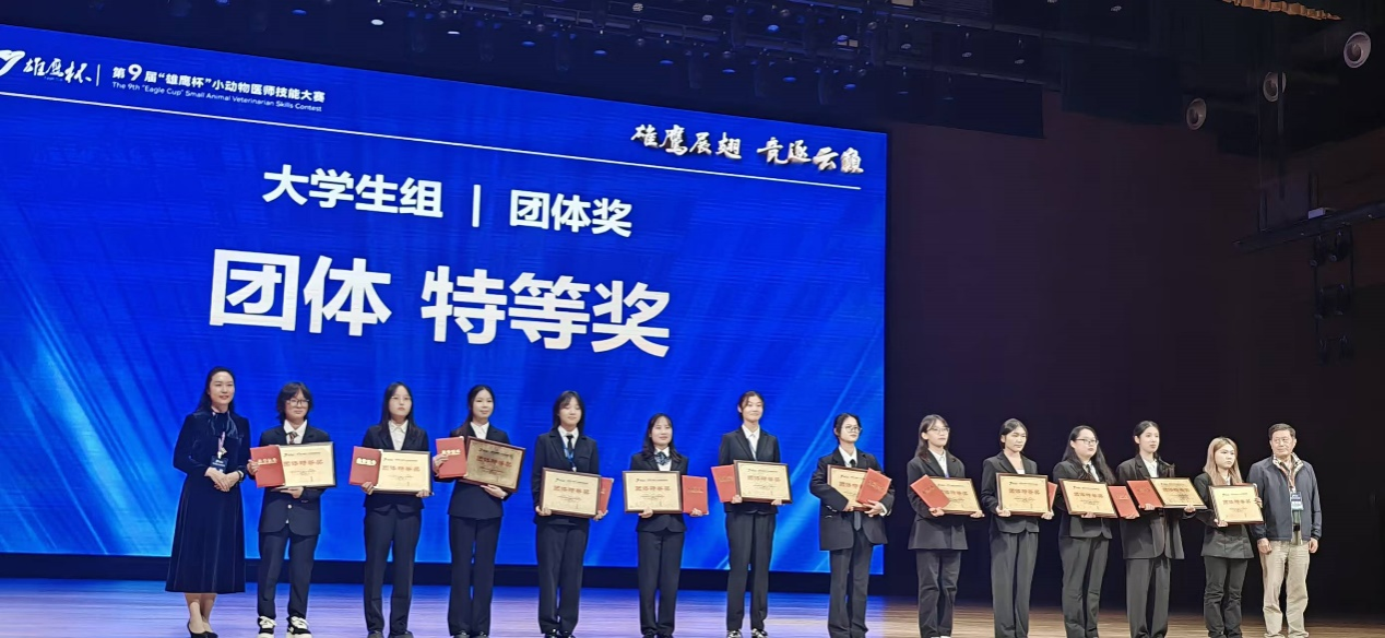 bat365官网bat365官方网站参赛队伍由才冬杰老师(领队)、周紫峣老师、胡延春教授3名指导教师以及陈佳雨、陈彦杉、李林楠和周桢力4名动物医学专业本科生组成。bat365官网代表队凭借扎实的理论基础、熟练的操作技能和默契的团队配合在120支队伍中脱颖而出,荣获 “雄鹰杯”大赛大学生组团体特等奖。此外,陈佳雨同学获兽医新星奖,指导老师团队荣获优秀辅导老师奖,学院获得最佳院校组织奖。至此,bat365官网bat365官方网站已连续四届获得“雄鹰杯”大赛特等奖,且在本届大赛中实现所有奖项的大满贯。