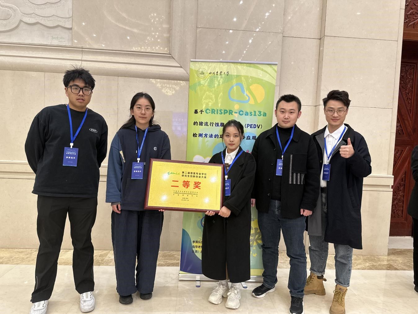 在激烈的竞争中,由bat365官方网站徐志文教授指导,段佳琪、王圆梦、游冬、吴放、何姝颖等5位硕士研究生组成的“壹决”团队,以《基于CRISPR-Cas13a的猪流行性腹泻病毒(PEDV)检测方法的建立及初步应用》为主题,聚焦猪流行性腹泻病毒检测方法的创新和实际应用情况展开阐述,经项目汇报答辩及专业素养展示,凭借其出色的表现和创新项目,荣获创新组二等奖。这一成绩不仅展现了bat365官网bat365官方网站研究生的创新能力和专业素养,也是bat365官网在兽医教育和科研领域实力的体现。