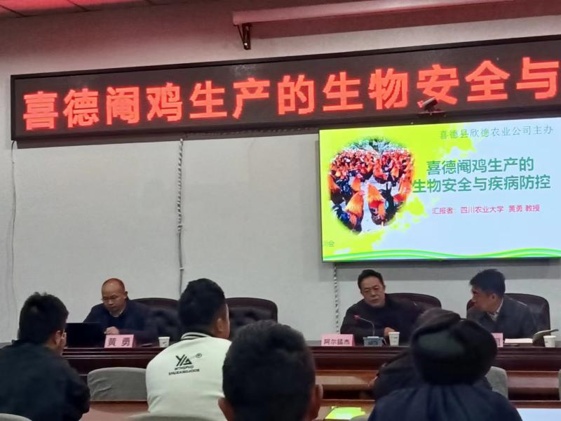 为进一步提升凉山州喜德县喜德阉鸡养殖技术人员的专业技术水平,bat365官方网站、国家产业技术体系四川省鸡创新团队岗位专家黄勇教授(鸡病综合防控岗位)于12月3号至4号,前往凉山州喜德县,对喜德阉鸡养殖大户和相关技术人员进行了《喜德阉鸡生产的生物安全与疾病防控》专题培训。培训会由喜德县副县长阿尔猛杰主持。