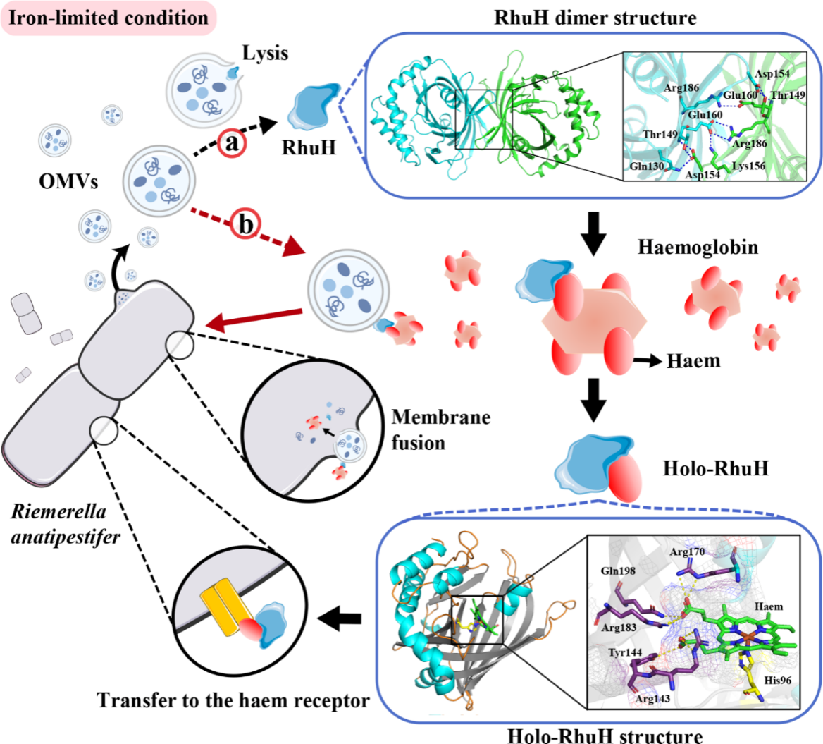 在铁离子限制条件下,RhuH通过外膜囊泡分泌,并以两种可能的形式从宿主血红蛋白中高亲和力地夺取血红素(图2):(a)经菌体分泌的外膜囊泡裂解释放出RhuH,RhuH从宿主血红蛋白中夺取血红素,并将结合的血红素转递给相应的外膜血红素受体;(b)定位于外膜囊泡表面的RhuH直接从宿主血红蛋白中夺取血红素,随后外膜囊泡通过膜融合的方式将血红素转运回细菌胞内以供利用。