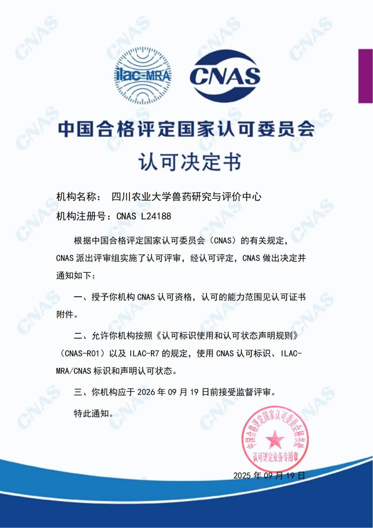 近日,bat365官网兽药研究与评价中心(以下简称 “中心”)正式获得中国合格评定国家认可委员会(CNAS)颁发的检测实验室认可资质。这不仅标志着中心的检测能力通过国家权威认证,更意味着其检测结果、出具的报告将具备国际公信力与互认效力,为后续开展跨区域、国际化兽医检测工作奠定核心基础。