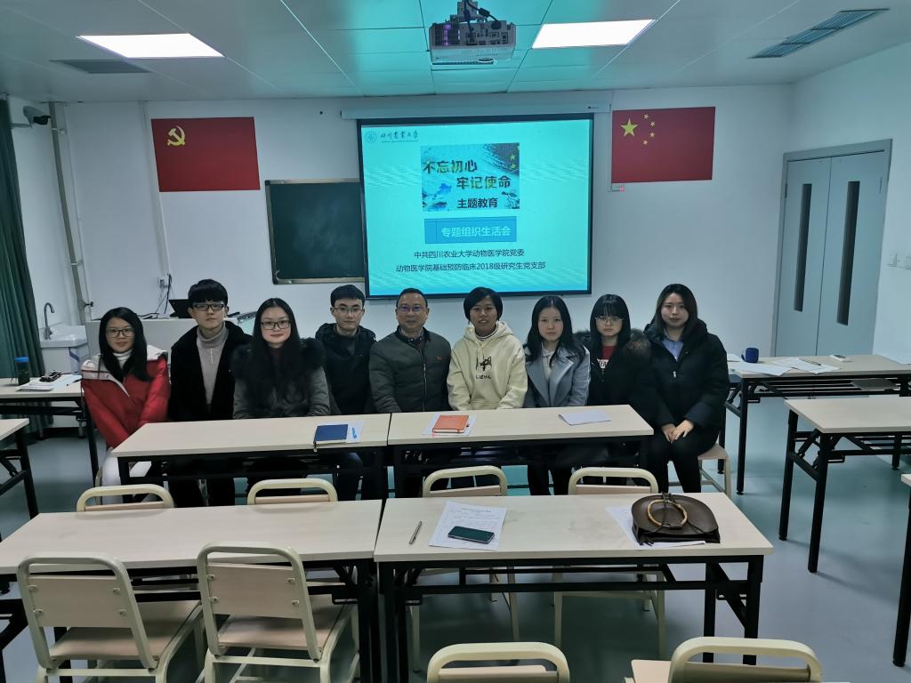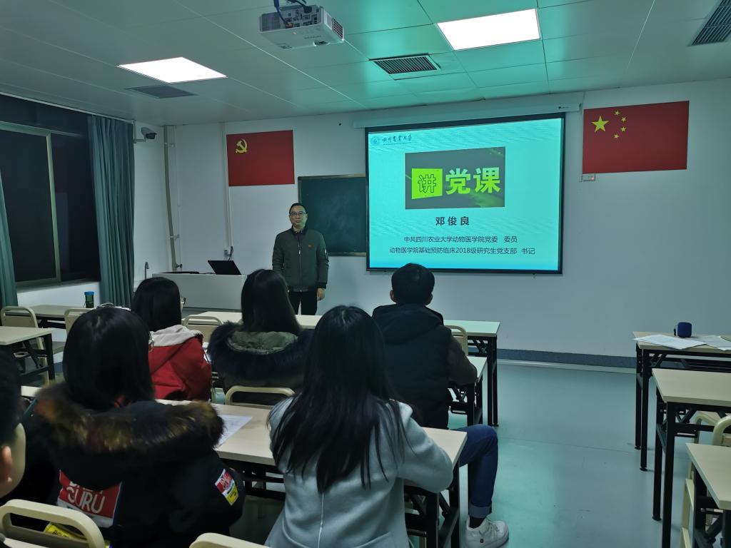 为扎实推进“不忘初心、牢记使命”主题教育,12月10日晚,中共bat365官方网站基础预防临床18级研究生党支部书记邓俊良以“不忘初心、牢记使命,做四有好老师”为主题于川农第八教学楼205教室为全支部同志上了一堂生动的党课。bat365官方网站党委委员孙贤刚及党支部全体党员参加了此次活动。