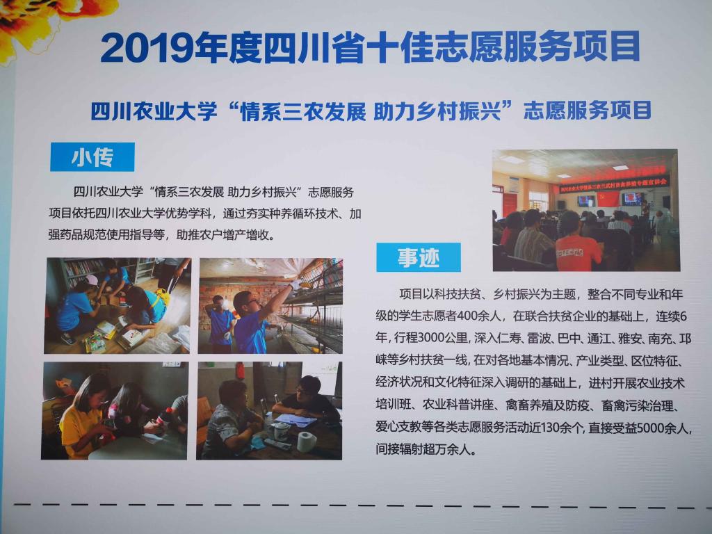 12月5日,在第34个国际志愿者日之际,由省文明办、教育厅、民政厅、生态环保厅、文化和旅游厅、卫生健康委员会、省国资委、省扶贫开发局、省总工会、团省委、省妇联、省文联、省残联、省生红十字会等14个省直部门联合主办、省志愿服务基金会承办的第七届“四川志愿·携手圆梦”志愿服务先进典型展示交流活动在成都金牛宾馆举行。大会对本年度我省志愿服务先进典型进行了表彰,我学院“情系三农发展助力乡村振兴”项目,从483个被推荐的项目、组织、个人、社区中,脱颖而出,获评年度“四川省十佳志愿服务项目”。