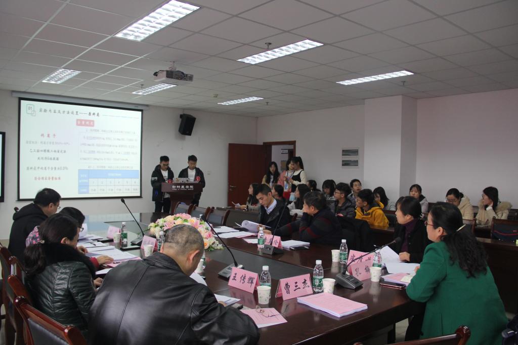 经过初轮激烈的竞争,有8个小组进入大赛的决赛阶段,这8个组的学生经过2周的时间对卡巴匹林钙的原料药及可溶性粉进行了相关检验,进入最后的答辩环节,参赛同学以PPT答辩的形式为观众展现实验操作流程及关键步骤,药品作用原理、状态检测、成分鉴定……“尿素含量分别为6.86%、6.13%、6.06%,标号1909004高于检验标准,编号1910111、1910112低于检验标准。”第四组参赛者说道,和别组差异较大的实验结果引起了评委的讨论。