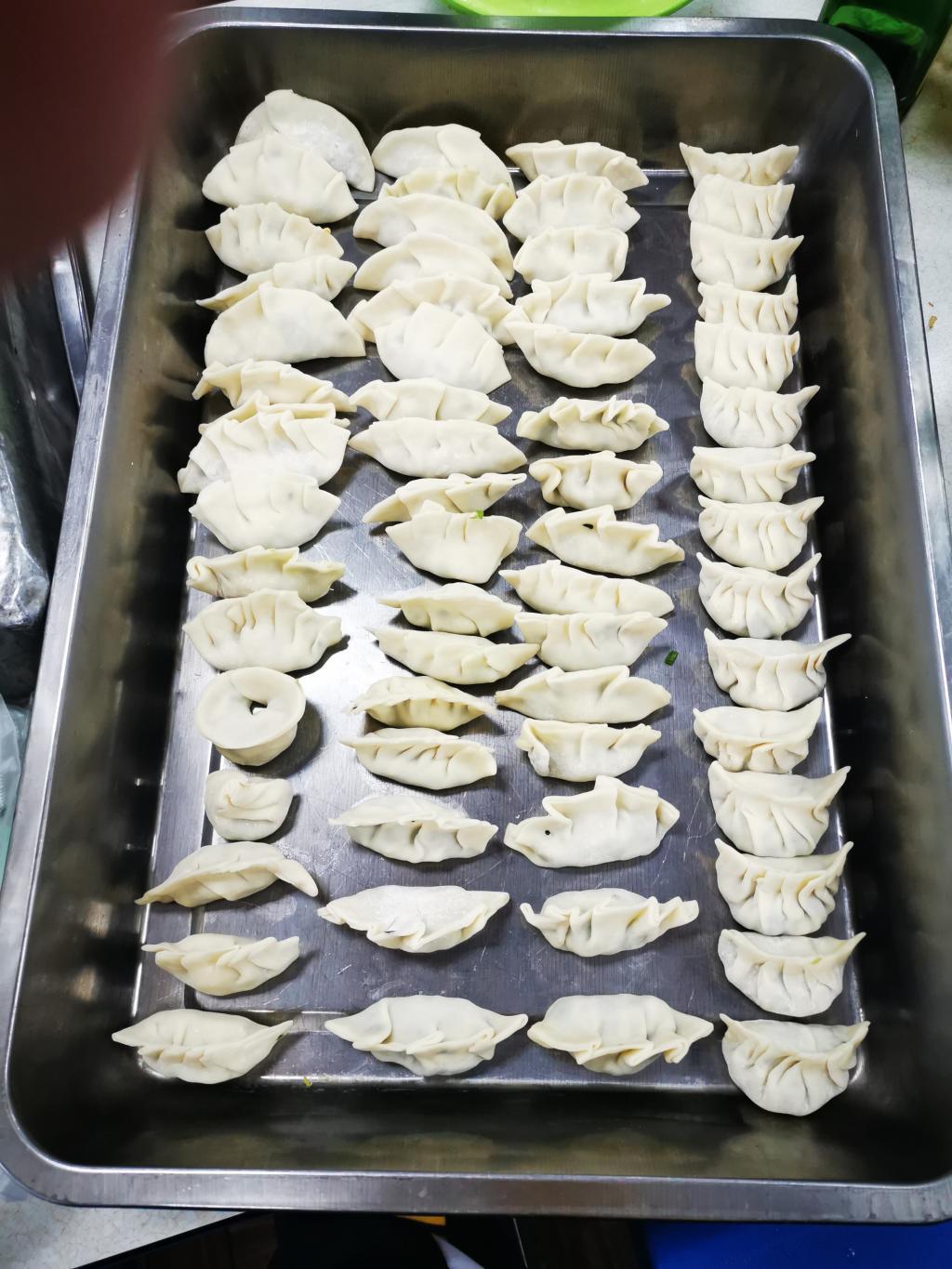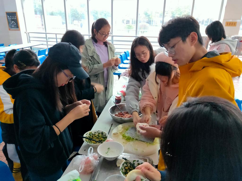 洗菜、切菜、剁肉、和面、配料……上午的食堂一隅可谓“热火朝天”,在食堂面食窗口的工作人员指导下,志愿者们将购买回来的食材分小组,依次分工处理。满满一大盆馅料准备好后,放馅、折褶子,最后捏合两边,一个圆滚滚的白皮饺子便在志愿者手中“诞生”。“你看我的饺子!”“我这个才好!”……饺子组成员互相“攀比”,制作间里满是欢声笑语。看着圆鼓鼓的饺子,饺子组组长笑着说:“饺子里装的不仅仅是馅料,更是我们对保安大叔和宿管阿姨的感谢与美好祝愿。”说话间,一个“胖”饺子就在他手中完成。一名北方学生说:“我从小吃的都是蘸饺,也很想让叔叔、阿姨们尝尝东北蘸饺,但因为天气太冷,我们煮的汤饺,希望他们能吃到热腾腾的饺子。”