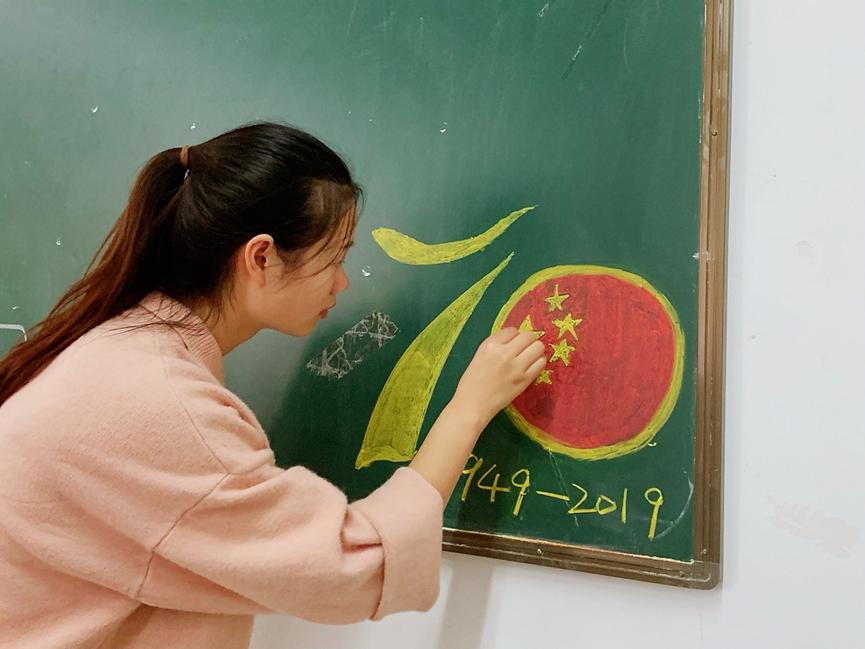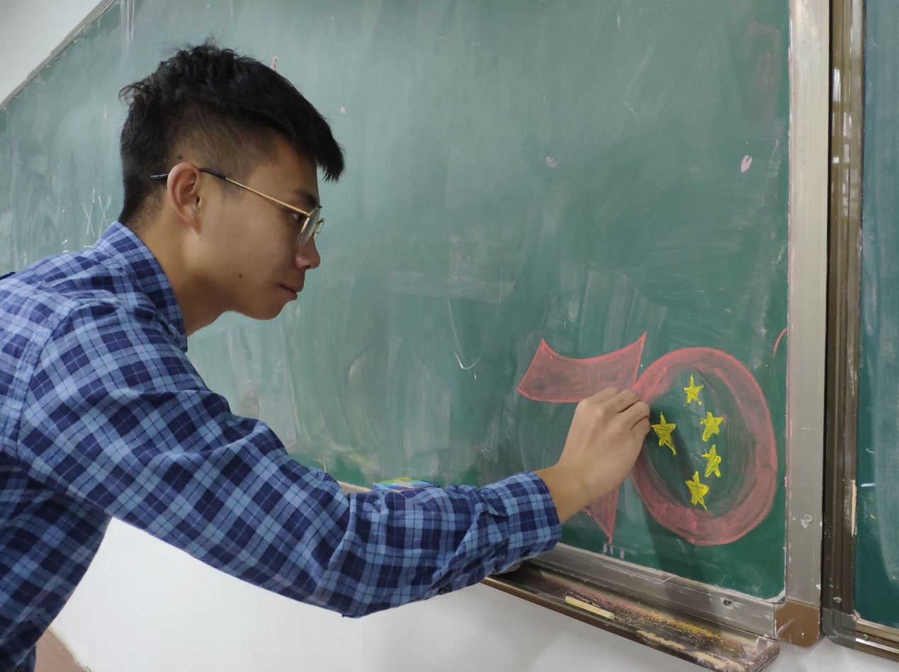 “中国的昨天已经写在人类的史册上,中国的今天正在亿万人民手中创造,中国的明天必将更加美好”。参与绘画的李娜说本次创作的灵感来源于国庆的阅兵,在党员小组一同学习了习近平总书记在阅兵式上的讲话后,她颇有感触国家的明天将由青年人携手创造,自己想把这份光荣的责任表现给更多人看,所以选择在人流量大的教室,以这种简明直接的方式,向周围的同学传递正能量。其他参与的学生党也都表示,在画国旗的时候,内心不由地热血澎湃起来,像是把自己带回到国庆盛大的现场;大伙一起参与的小小举动,能把自己的爱国热情和学好知识以报国的志向,传递给同学。