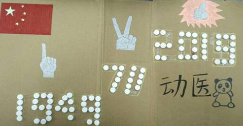 四幅主题图画分别从不同角度表达了对祖国的祝福,作品“中国一点都不能少”以板蓝根颗粒制作国境线代表我国包括南海台湾在内的中国领土一点都不能少,以头孢片的粉末制作五星代表中国人民一个都不能少,整体寓意中华民族必将在国家领土主权完整的基础上,实现中华民族伟大复兴。作品“以国为家”表达了新中国成立70年来,人民过上幸福生活,以黄色为路代表70年建设探索,以蓝色为河流代表生态文明建设。作品“国旗下的成长”以国旗下呈阶梯状的1949-2019这70年折线图,代表70年的新中国的向上向善的发展趋势,以三个手势分别代表屹立东方、改革开放、复兴之路三个时期,代表中国从站起来、富起来到强起来的伟大飞跃,以bat365官方网站特色熊猫图案表达动医人在强国之路上功成必定有我的责任担当!作品“中华民族同心逐梦”以五颜六色药品组成“70”“五角红旗”表达70年来五十六个民族为新中国的建设共同努力,以纱布组成天安门表达各民族有同一个信仰,整体寓意各民族同心追逐中国梦。
