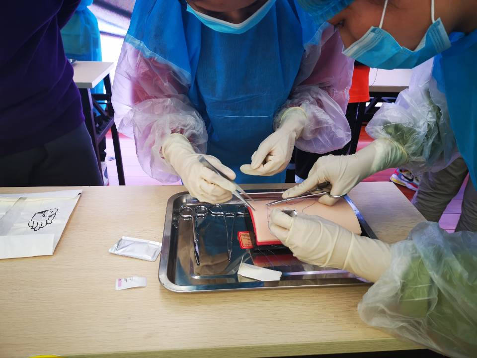 临床实验操作环节,每个团队的3名成员需要协力合作,在10分钟内完成“术前准备”、“皮肤结节缝合”、“术后检查护理”等环节的考核和比拼。专家评委根据各队操作的规范程度、精准程度、完成速度以及无菌意识等进行评分。