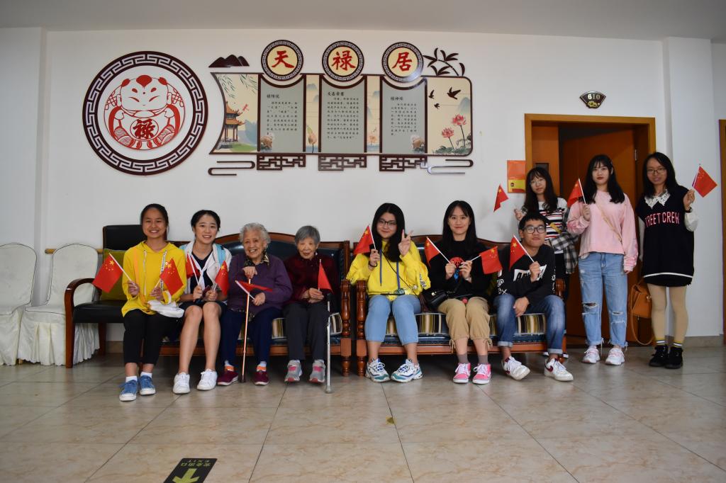 活动开始,同学们分为三组,有序而安静地排队进入天乡养老院,听从工作人员指挥。在第一环节,同学们帮助工作人员清理养老院的卫生,清扫、擦拭养老院一到三层以及院子中的各种设施。在打扫的过程中,同学们还与老人们交流,关心他们的生活日常。同时,也有小组的同学开始采访老人们对于新中国成立70周年的感想以及想对祖国说的话。此后,同学们与老人们一起弹钢琴、唱红歌,畅谈时代变迁,工作人员为同学们的表现表示肯定。