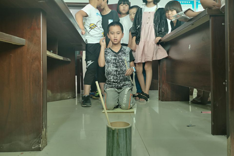 比赛时孩子们都乐在其中。只见投壶的小朋友双膝着地,上身平直,目视前方投壶,右手持箭矢,神态严肃认真。一旁“观战”的小朋友们手握拳头,仿佛自己手里也握着矢。一旦投中,全场就是一阵欢呼,投不中的也不气馁,愈战愈勇。在投壶项目里,大家都急切地想要分享经验,场面十分热烈。投壶作为一个流传几千年的项目,魅力丝毫不减。此后,双人气球接力跑比赛激烈进行。作为接力赛,这项运动主要考察的是团队的合作精神,四人一组,两两夹球,来回跑步。激烈而有趣的比赛将现场气氛一度推向高潮。其中陈鑫小朋友表现特别好,她对志愿者讲到:“我一直都很好奇古人的娱乐方式,今天体验了投壶后,感觉特别好。平时在家我爸妈总叫我不要玩手机,但是不玩手机我又觉得很无聊。之后我可以放下手机和小伙伴们玩投壶啦!”