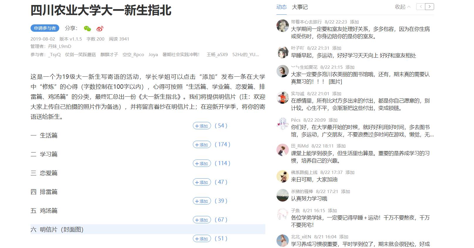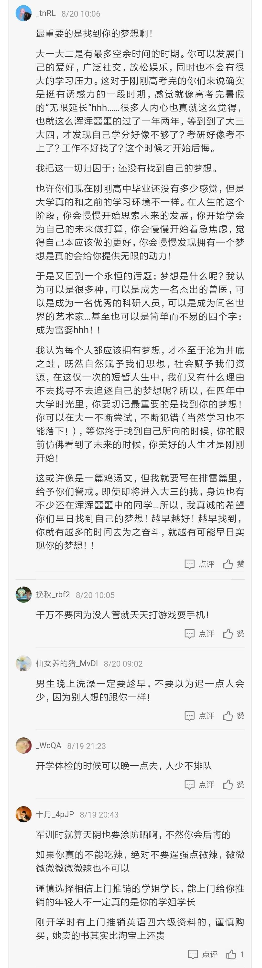 活动自7月中旬一发起,很快就有百余名动医“老人”纷纷在活动平台上留下自己的寄语。有位同学留言道,她认为写寄语是一件有温度的事情,希望新生们看到寄语都能够在大学生活里更快找到自己的目标。也有同学感叹道,自己当初如果收到学长学姐的寄语,是不是会少走很多弯路。在活动进行过程中,陆陆续续吸引了各专业各年级的动医同学的参与,留言中不乏为吃货同学介绍学校食堂哪个窗口最受欢迎,学校外面哪些店实惠的,怎么搭配“不长胖”,怎么搭配能让父母都让你“少吃点”。“指北”留言中也有不少师兄师姐们的“血泪史”——虽然大学生活有充足的自由空间,但放松的同时不能忘了学生的首要任务还是学习,一旦放松,真实回首已百年啊!也有暖心叮嘱要注意身体健康的;也有希望新生们在大学期间多多体验不同的东西,大胆努力,提升自己,不要胆怯,遇见更好的自己等等。