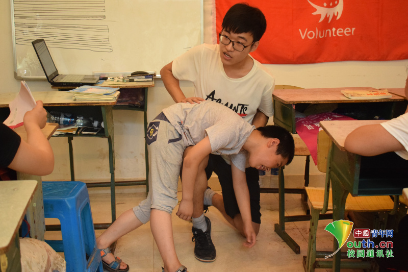 7月19日,志愿者秉承教育“爱自己”的活动主题,结合乡村实际情况,着重讲授了关于防溺水的理论实践知识,针对溺水时的不同情况,教授了不同的应对方案:“手脚抽筋者,需将手握拳,然后用力张开,迅速反复多做几次,直至消除抽筋为止。”志愿者牛耀群简洁而生动的表述,配以与孩子们夸张灵动的共同演示,一时间课堂上笑声不迭。