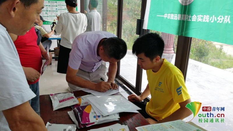 团队设点进行兽药发放。村民正排队领取兽药及宣传册,签署兽药领取单,成员也仔细帮助村民核对信息。中国青年网通讯员 唐天钢 摄