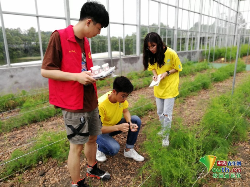 小队成员进行芦笋采样比对,需采摘不同品种茎段1-2cm装置于不同取样器中,同时也需对种植的土壤进行采样。中国青年网通讯员 唐天钢 摄
