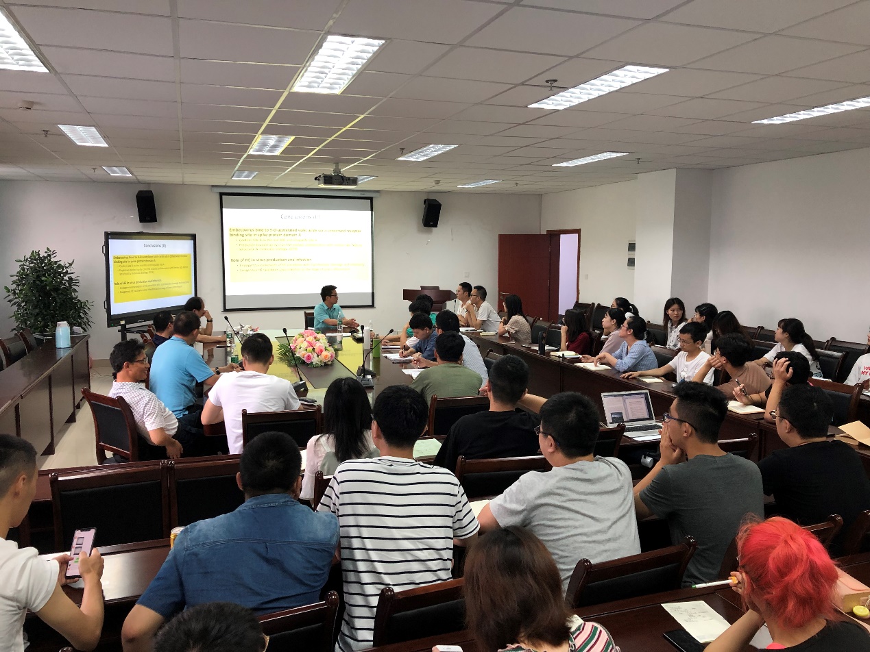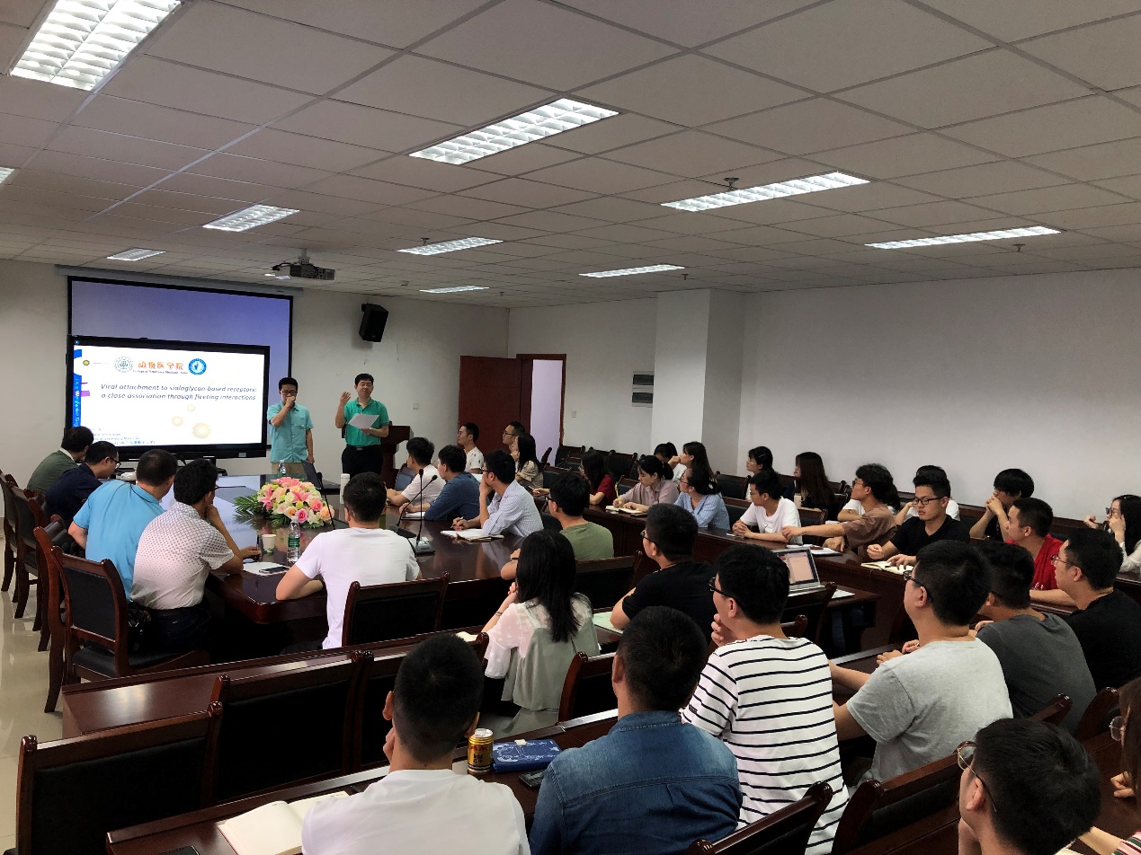 郎一飞介绍了荷兰攻读学位期间的基本环境,从3个角度进行学术交流,即“作为三大生命物质之一糖,在生命活动中的作用及研究背景”介绍、“二糖与病毒两者如何关联,科学问题的引申提出”、“唾液酸、病毒HE蛋白、病毒突刺蛋白在病毒与宿主结合入侵过程中的位点及作用的验证”。