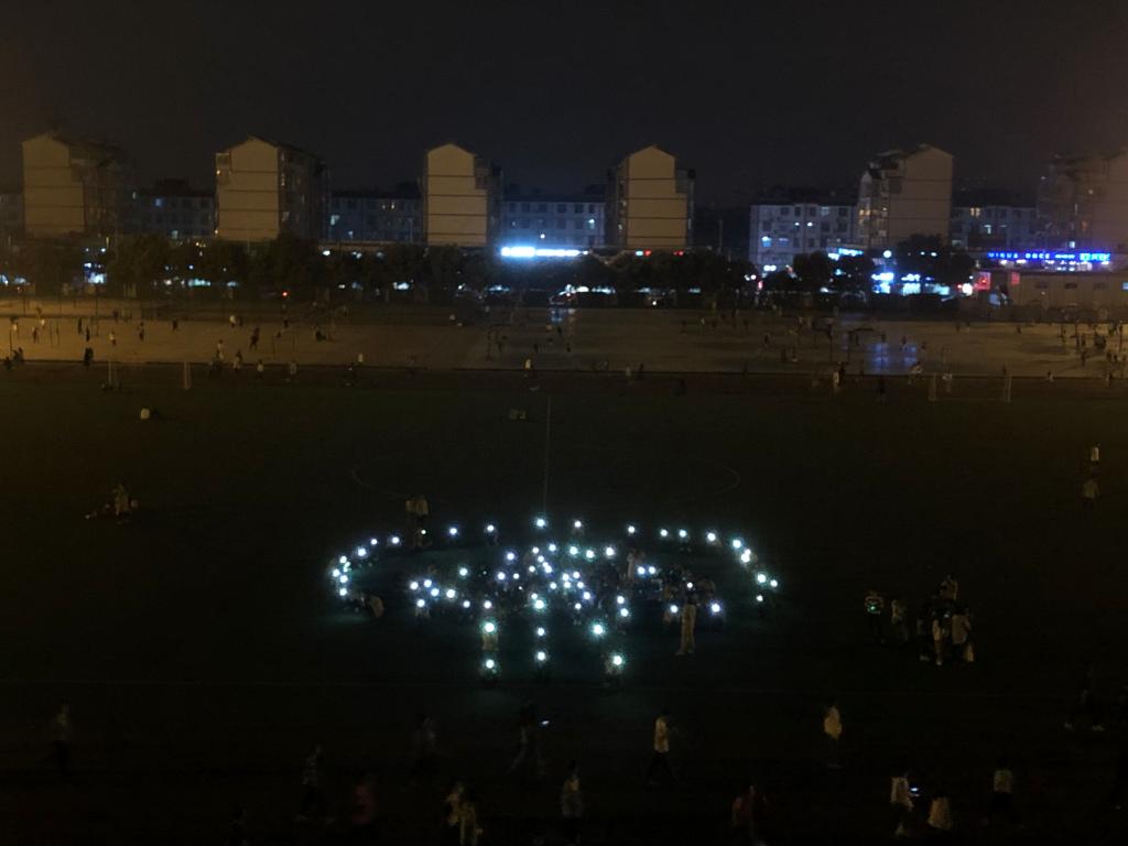 除了个人的行动,有不少同学还积极参与到活动的现场宣传中。他们十数人或几十人集合在一起,打开手机照明,在操场上围成“灯泡”、“爱心”等图案,并在“灯芯”在指令下有节奏地定时熄灭手机灯,宣传“熄灯一小时,为地球节能”的活动主题。巨大灯泡、爱心的一开一关,引得路过的师生驻足观看和点赞。