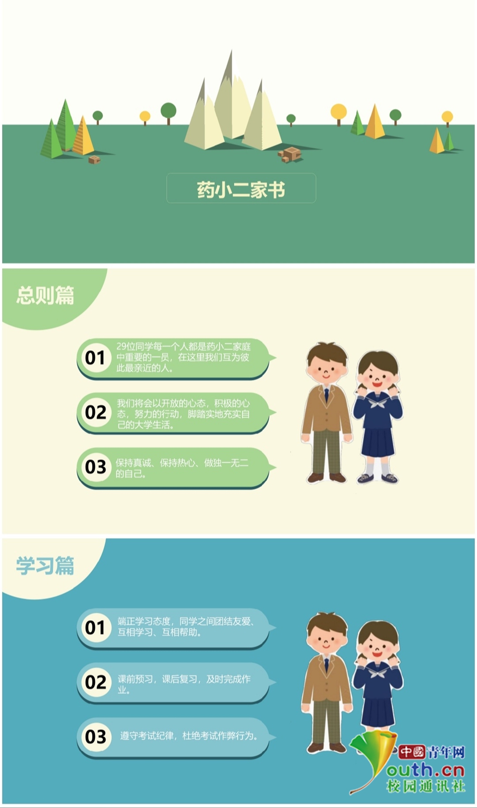 3月23 日,《药小二的电台》第一期节目在网上播出。“一家人就是要团聚在一起、谈天说地在一起、努力进步在一起。只有在一起的我们,才是班规的开始,才是家文化的开始。”该班主播阿舟、Jenny收集分享了许多班级小伙伴对“家文化”的深刻理解与建设性意见。该班同学杨雨(化名)来信:“家文化就是班级成员发自内心愿意为班级建设,以班级优先的态度。是各自成员交流无隐晦,各成员在班级自如地生活。”除了该班同学们对班规的建议之外,还有来自同学刘钰精心雕琢的关于药小二这个虚拟人物与同学们之间的温情故事的投稿。网友@骨骼线条粗大少女说:“晚上听着和自己班有关的事情睡觉肯定很有趣,我先干了这杯柠檬汁。”