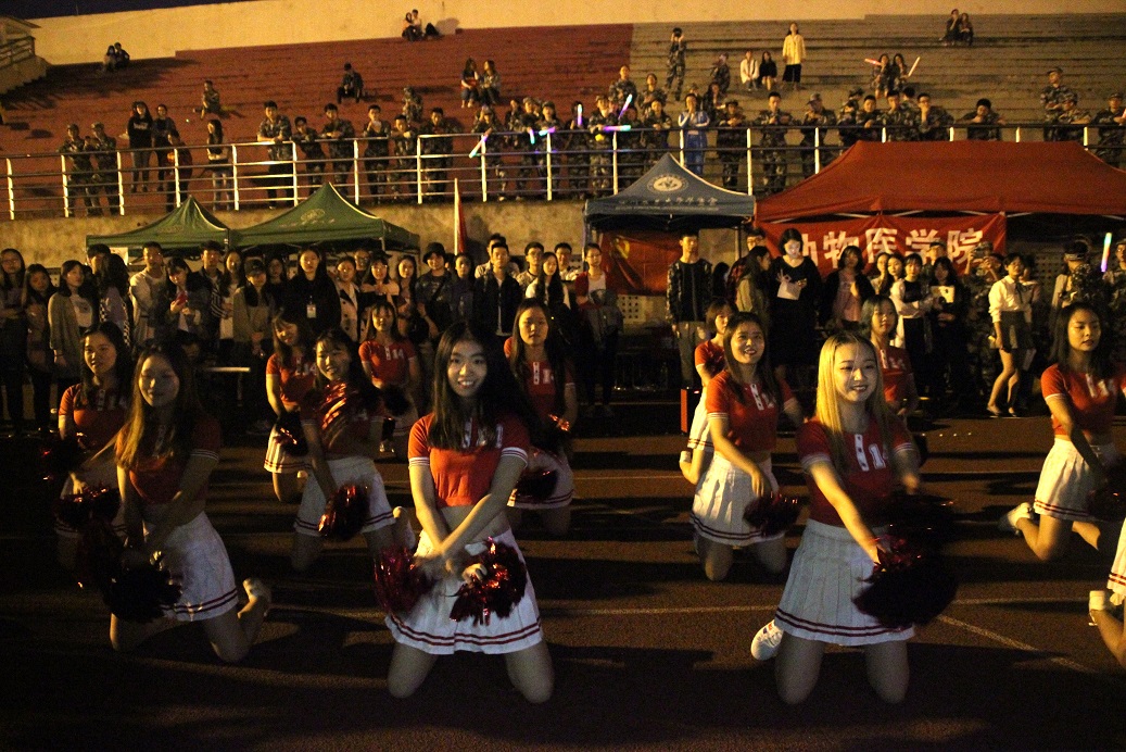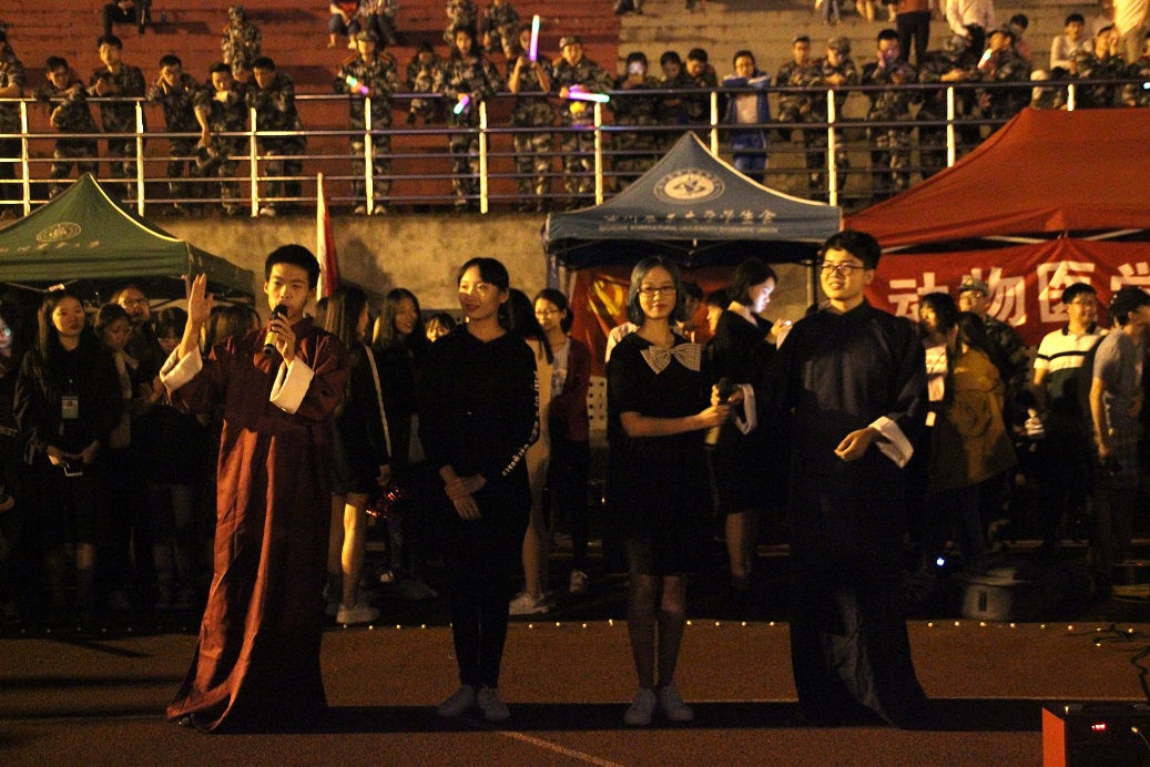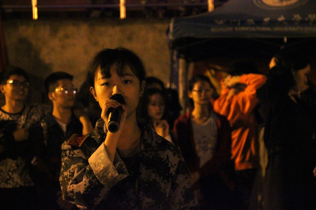 五彩灯光环绕作舞台,荧光棒下是新生一束束期待的目光,在一片叫好声中,演出正式开始。受邀表演的学校爵士舞团火辣热情的《因为红》舞蹈表演一开场便引得尖叫连连,《军训三句半》可谓说出观众们的心声“把军训的那种苦中作乐表现出来了,我觉得很有趣”,一位新生被逗得捧腹大笑。古典舞串烧,温婉悠扬声里细腻唯美,《Sorry not sorry》啦啦操全力“开火”,一静一动里气氛更加热烈。一曲《晴天》唱出新生的期盼,几日的连绵阴雨中愿求晴空万里。演出间歇,一位新生也勇敢上台献唱《易燃易爆炸》,其自信大方的表演获得在场观众的掌声。