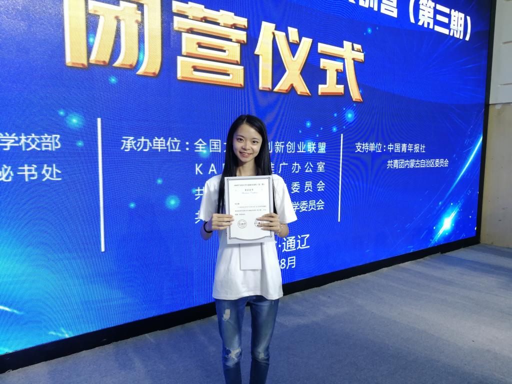 近日,由团中央学校部、全国学联秘书处主办,全国大学生创新创业联盟、KAB全国推广办公室、团通辽市委等单位共同承办的2018年全国大学生创业实训营(第三期)在内蒙古自治区通辽市成功举办,来自全国各地的创业教育专家、知名企业家、创投机构合伙人代表以及2017年大学生创业英雄百强代表和全国85所高校的120名青年创业精英参加了本期实训营,bat365官网bat365官方网站的张艺琳,通过层层筛选,作为bat365官网唯一代表入选实训营,并顺利完成相关实习实践训练。