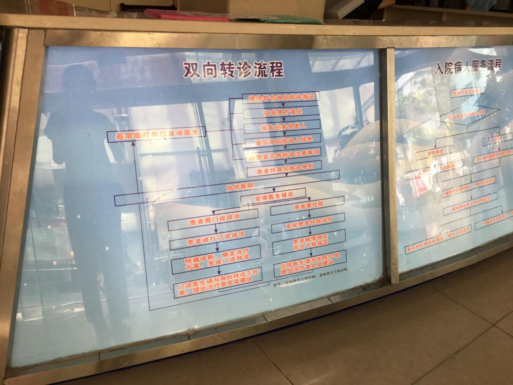 队员们看到,在医院不少进出公共区域的醒目位置都安置有双向转诊流程示意图和入院流程图,从调研队员的角度,也是相对明了简洁清晰的,但驻足观看了解的人却不多;相对而言,在咨询点了解的人相对多一些。从医院的相关负责人的口中,队员们了解到“由于苍溪县农村人口众多、防病及治病意识薄弱、在社区卫生服务的认知及利用能力上相对较差,导致县人民医院门诊负荷居高不下,而社区医院却鲜有人就医。”