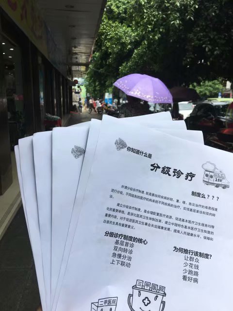 调研结束后,团队成员便开始在苍溪县县城发放分级诊疗宣传单,向民众宣讲分级诊疗制度。同时,根据民众的反馈等,向医院等提出了优化放置相关宣传制品位置的建议,以期能让更多人了解“基层首诊、双向转诊、急慢分治、上下联动”的分诊理念。后期团队还将细致梳理调研内容和数据,融入自己的专业所学撰写调研报告,并向相应机构积极反馈,希望为祖国优化和完善医疗卫生服务体系贡献青春的力量。
