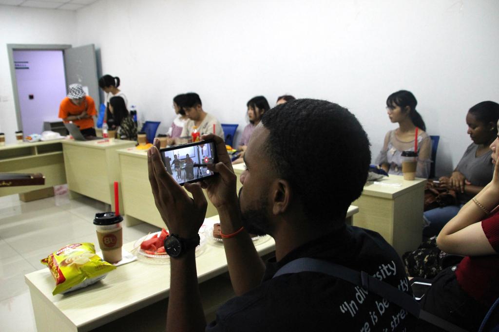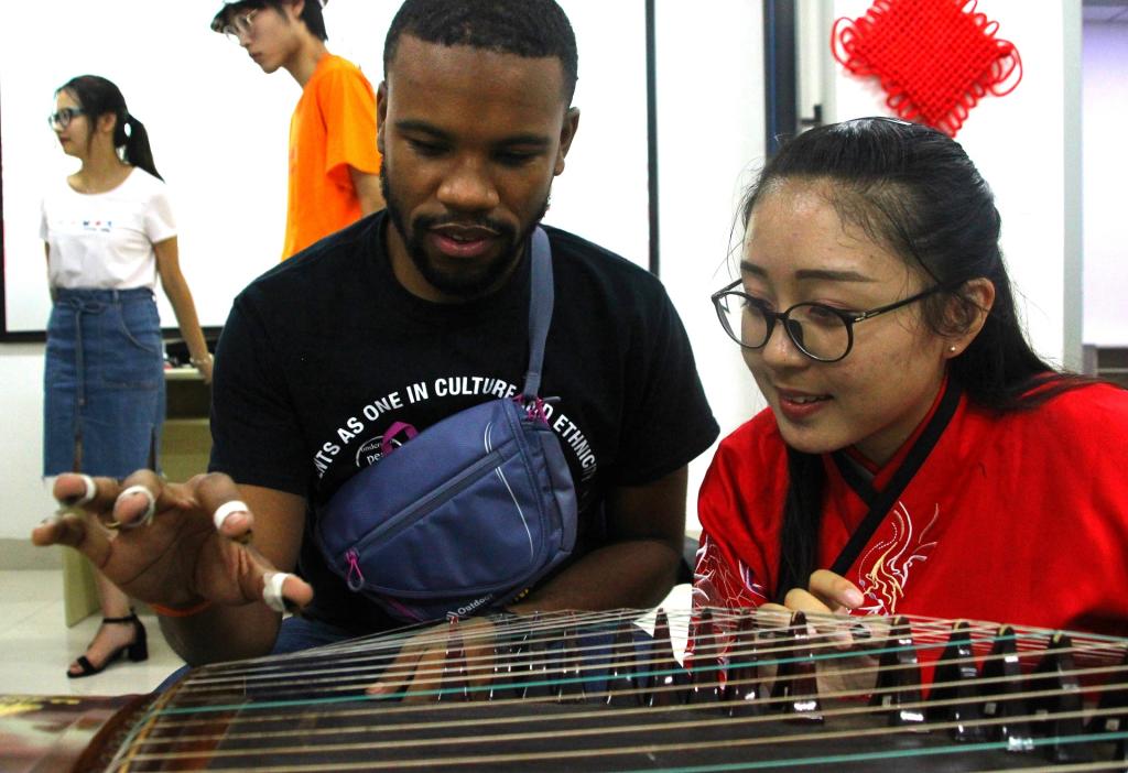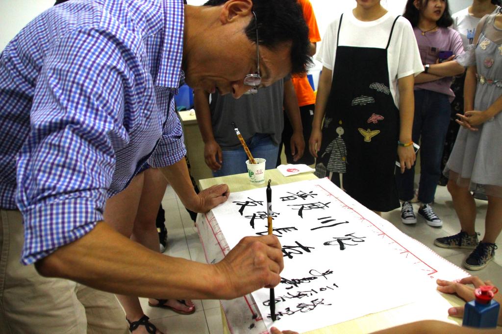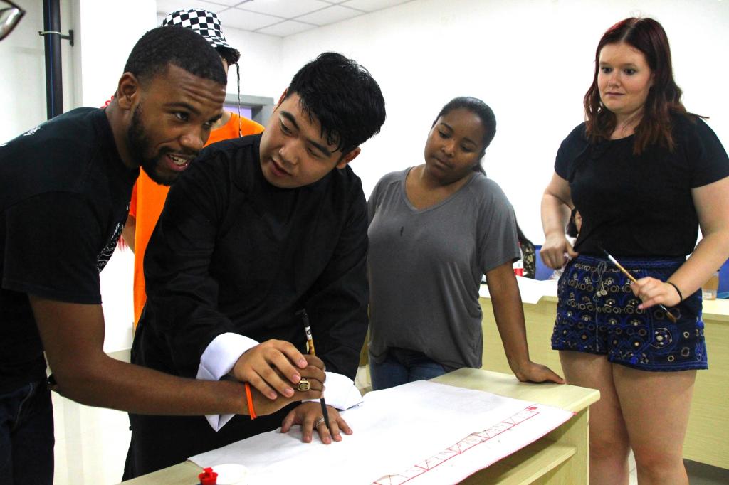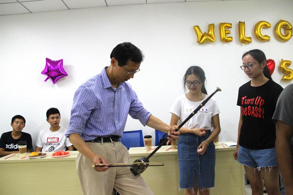 姜朕元同学的书法展示引起美国学友兴趣,一支毛笔、一卷宣纸,史月异提笔在纸上留下“川农普渡,友谊长存””八个汉字,写下两校的情谊。几位美国学生也在纸下留下自己在美国学习了解中国文化时习得的“和平”、“开心”等汉字。“一条大河波浪宽,风吹稻花香两岸”动医2位同学教美国学友唱《我的祖国》,悠扬的歌声赢得在场师生的声声喝彩。演奏古筝二胡的同学,也悉心教交换生同学们演奏简单曲子,气氛融洽。
