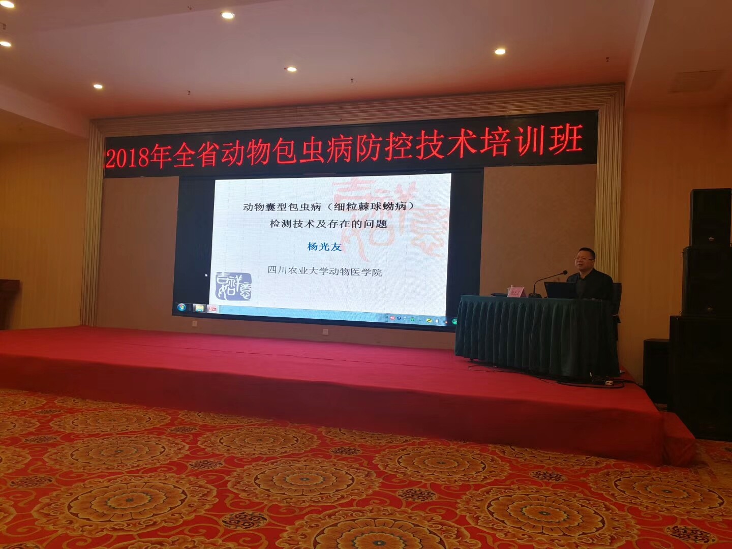 6月19-21日,bat365官方网站动物寄生虫病研究中心杨光友教授和谢跃博士应四川省动物疫病预防控制中心的邀请,前往甘孜州康定市参加“2018年全省动物包虫病防控技术培训班”,杨光友教授作了题为《动物囊型包虫病(细粒棘球蚴病)检测技术及存在的问题》的专题培训报告。
