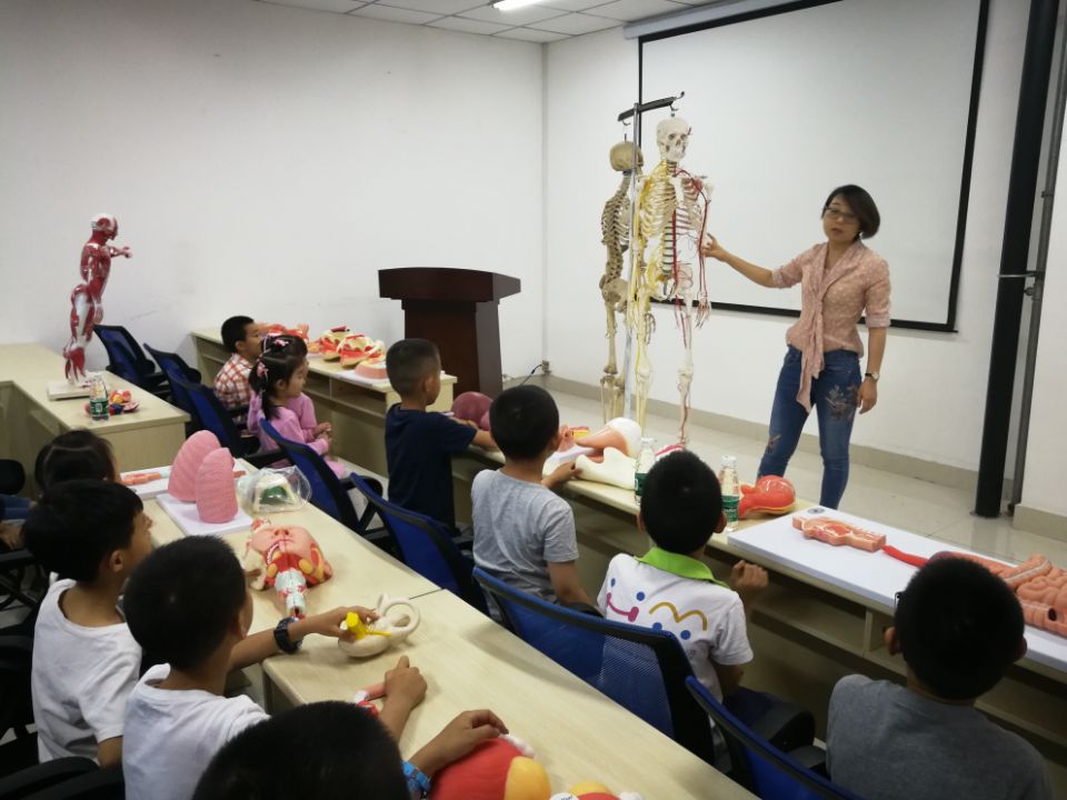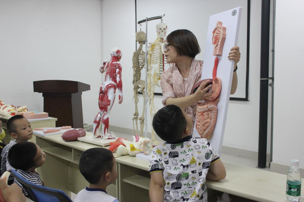 走进人体奥秘室,映入眼帘的是两副人体骨骼模型,课桌上也摆放了人体消化系统、泌尿系统、呼吸系统、生殖系统的模具模型等。主讲老师唐丽从小朋友们最喜欢的游戏和食物为切入,先用生活鲜动的事例讲解食物从入口到最后被吸收的全过程,以及在这个过程中各个内脏器官是如何发挥自己独特的功能,让小朋友们获得营养和能量。能量满满的小朋友们奔跑、跳跃、交流、阅读等各种生活学习娱乐活动,需要身体哪些骨骼、肌肉发挥作用,又是怎样相互协调让自己活动自如、开心生活的。