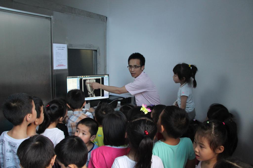 走进教学动物医院的门诊大厅,小朋友们都首先领到一副听诊器,医院老师们用这个最常见医用器具,让小朋友们通过听诊器真切的感受自己和小伙伴生命的跳动。然后一一给小朋友们讲解如何带自己的心爱的宠物来宠物医院就诊,应该让它们得到舒适周全的医疗,最终康复欢快的生活。讲解中,小朋友们戴着听诊器,像小医生一样,奔波于门诊部、生化仪检测室、观察室、B超仪诊断中心、DR检查室、住院部、手术室等多个科室,根据不同病例为宠物提供最好的诊断和治疗。很多科室还让小朋友们亲自实践。