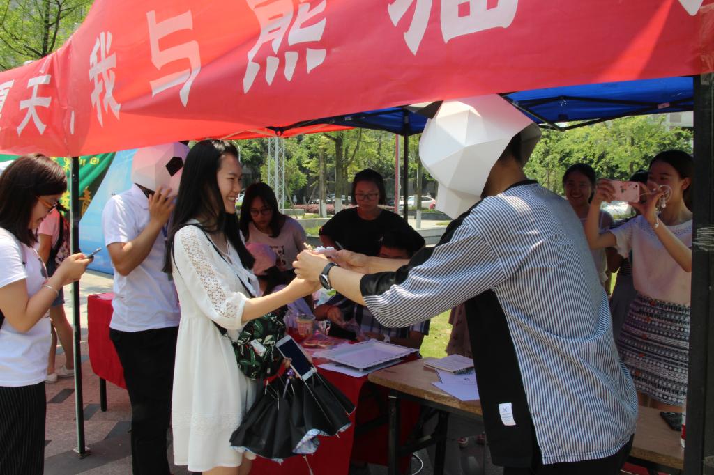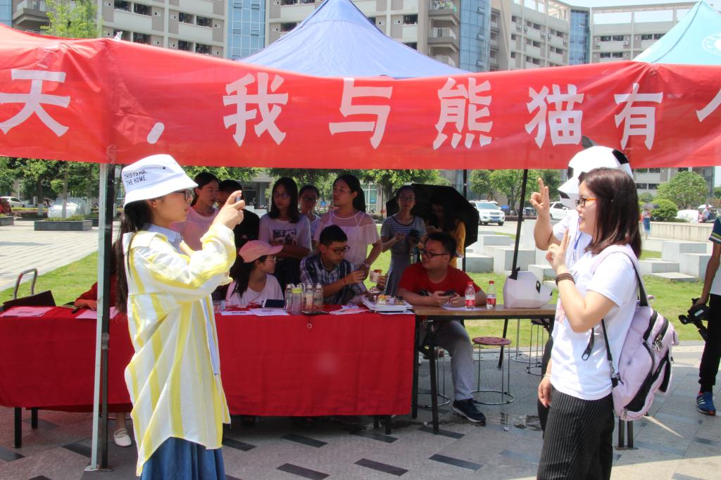 5月15、16日中午,印有“熊猫村,由你来守护”的大横幅出现在bat365官方网站成都校区的校园里。这是bat365官方网站青年志愿者协会和实践部的同学在为“我为熊猫代言——寻找高校熊猫村守护使”大型社会实践公益活动设点宣传,希望能有更多关心大熊猫生存状况的同学们加入其中。