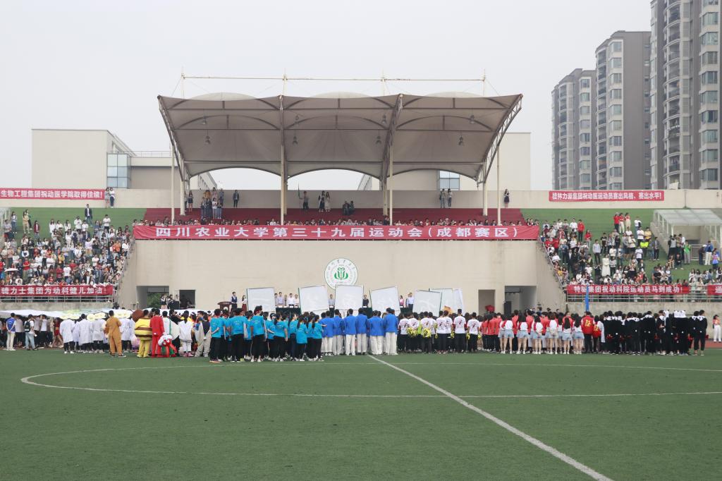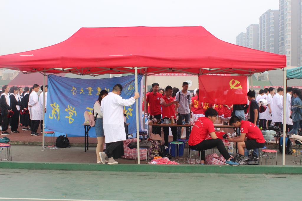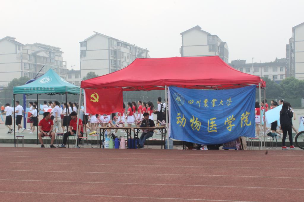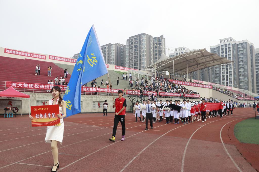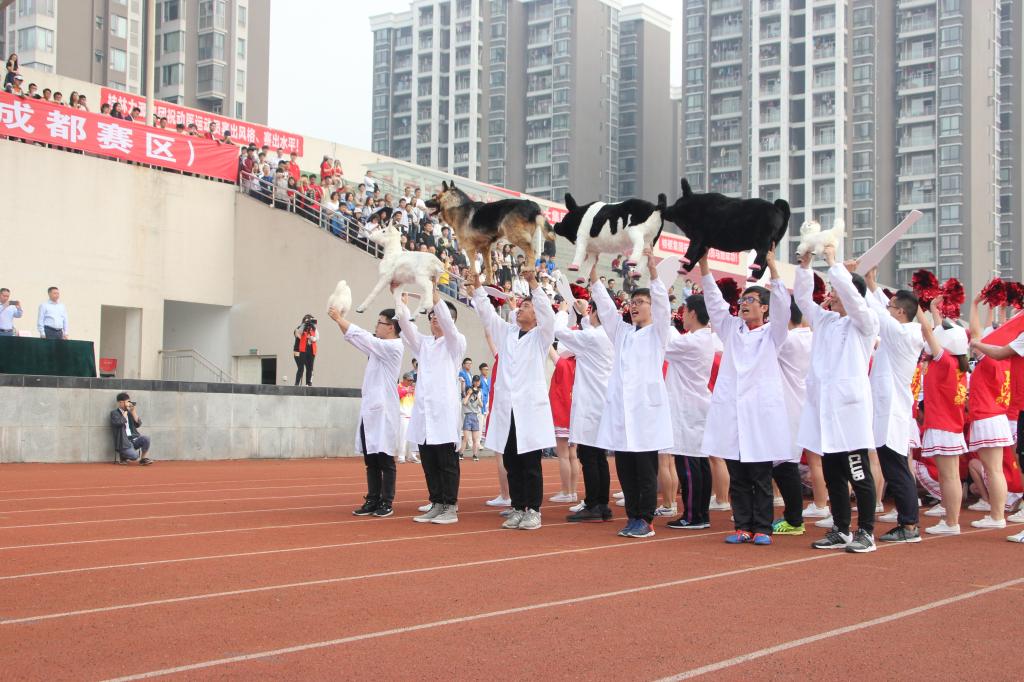 平时严谨认真的副院长贾仁勇老师,现在正头戴熊猫头套走在方阵前面。在老师身后走来的是两排身着实验服,第一排同学手执各种猪、牛、羊等动物标本,这些标本一肌一绒,尽态极“研”,一姿一容,恰如新生,既体现了动医院的专业特色,又创造了一个欢快跳脱的气氛;第二排同学手上拿着手术刀、听诊器、试管瓶、注射器等实验器具,动医风采尽显;中间是戴着学生自制熊猫头套的啦啦操队员,姿态矫健轻盈,后排运动员穿的熊猫衣服,萌趣,而又步伐坚定。当方阵走到主席台前,中间运动员拼出拿牌拼出动医院院徽以及“动医,雄起!”的字样。