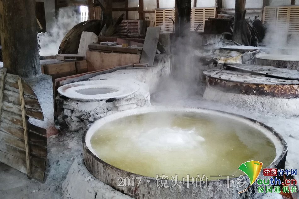 自贡燊海井,是人类钻井历史上第一口超千米深井,1988年,燊海井正式被四川省人民政府列为全国重点保护文物。燊海井一直保持传统的制盐方式,以盐锅煎制盐为主精产小部分盐品是亮点。大火熊熊燃烧,锅内盐水翻腾、白烟滚滚。福尔摩斯盐团队队员亲自体验制盐乐趣,看似容易的翻盐,没两下就见队员汗